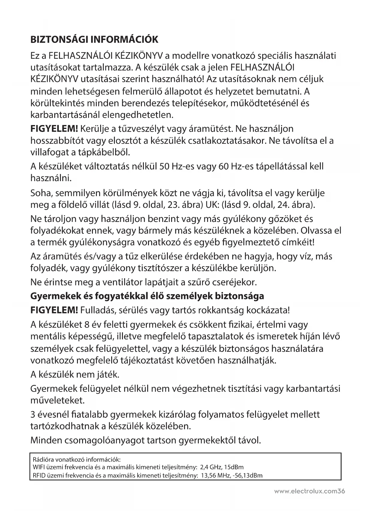 Ez a FELHASZNÁLÓI KÉZIKÖNYV a modellre vonatkozó speciális használati utasításokat tartalmazza. A készülék csak a jelen FELHASZNÁLÓI KÉZIKÖNYV utasításai szerint használható! Az utasításoknak nem céljuk minden lehetségesen felmerülő állapotot és helyzetet bemutatni. A körültekintés minden berendezés telepítésekor, működtetésénél és karbantartásánál elengedhetetlen. FIGYELEM! Kerülje a tűzveszélyt vagy áramütést. Ne használjon hosszabbítót vagy elosztót a készülék csatlakoztatásakor. Ne távolítsa ela villafogat a tápkábelből. A készüléket változtatás nélkül 50 Hz-es vagy 60 Hz-es tápellátással kell használni. Soha, semmilyen körülmények közt ne vágja ki, távolítsa el vagy kerülje meg a földelő villát (lásd 9. oldal, 23. ábra) UK: (lásd 9. oldal, 24. ábra). Ne tároljon vagy használjon benzint vagy más gyúlékony gőzöket és folyadékokat ennek, vagy bármely más készüléknek a közelében. Olvassa el a termék gyúlékonyságra vonatkozó és egyéb gyelmeztető címkéit! Az áramütés és/vagy a tűz elkerülése érdekében ne hagyja, hogy víz, más folyadék, vagy gyúlékony tisztítószer a készülékbe kerüljön. Ne érintse meg a ventilátor lapátjait a szűrő cseréjekor. Gyermekek és fogyatékkal élő személyek biztonsága FIGYELEM! Fulladás, sérülés vagy tartós rokkantság kockázata! A készüléket 8 év feletti gyermekek és csökkent zikai, értelmi vagy mentális képességű, illetve megfelelő tapasztalatok és ismeretek híján lévő személyek csak felügyelettel, vagy a készülék biztonságos használatára vonatkozó megfelelő tájékoztatást követően használhatják. A készülék nem játék. Gyermekek felügyelet nélkül nem végezhetnek tisztítási vagy karbantartási műveleteket. 3 évesnél atalabb gyermekek kizárólag folyamatos felügyelet mellett tartózkodhatnak a készülék közelében. Minden csomagolóanyagot tartson gyermekektől távol. Rádióra vonatkozó információk: WIFI üzemi frekvencia és a maximális kimeneti teljesítmény: 2,4 GHz, 15dBm RFID üzemi frekvencia és a maximális kimeneti teljesítmény: 13,56 MHz, -56,13dBmwww.electrolux.com 37 Elektromos információ FIGYELEM! Kerülje a tűzveszélyt vagy áramütést. Ha nem biztos benne, hogy a kimenet megfelelően földelt, vagy hogy időzített biztosítékkal vagy megszakítóval van védve, akkor a Nemzeti Elektromos Szabályzat rendelkezéseinek és a vonatkozó helyi előírásoknak megfelelően szakképzett villanyszerelőnek kell telepítenie a megfelelő elektromos csatlakozót. Ne használjon hosszabbítót vagy elosztót a készülék csatlakoztatásakor. Soha ne a tápkábelt húzva áramtalanítsa az egységet! Mindig határozottan fogja meg a dugót, és így húzza kiegyenesen a dugaszaljból. Ne csípje meg, hajlítsa meg, ne kössön csomót a tápkábelre. Ne vágja el és ne károsítsa a tápkábel. Ha a tápkábel megsérül, azt csak hivatalos Electrolux szerviz cserélheti. Ez a készülék nem tartalmaz felhasználó által javítható alkatrészeket. Mindig az illetékes Electrolux szervizzel javíttassa a készüléket. Ha a hálózati kábel megsérül, azt a gyártónak, a gyártó szerelőjének, vagy más, hasonlóan képzett személynek kikell cserélnie a veszélyhelyzet elkerülése érdekében. A tisztítás előtt az áramütés és a tűzveszély megelőzése érdekében feltétlenül áramtalanítsa a készüléket. MAGYAR Köszönjük, hogy az Electrolux PURE A9-40/PURE A9-60 légtisztítót választotta! A legjobb eredmények biztosítása érdekében mindig eredeti tartozékokat és alkatrészeket használjon. Ez a termék környezettudatosan készült. Minden műanyag alkatrész el van látva újrahasznosításra vonatkozó jelzéssel.