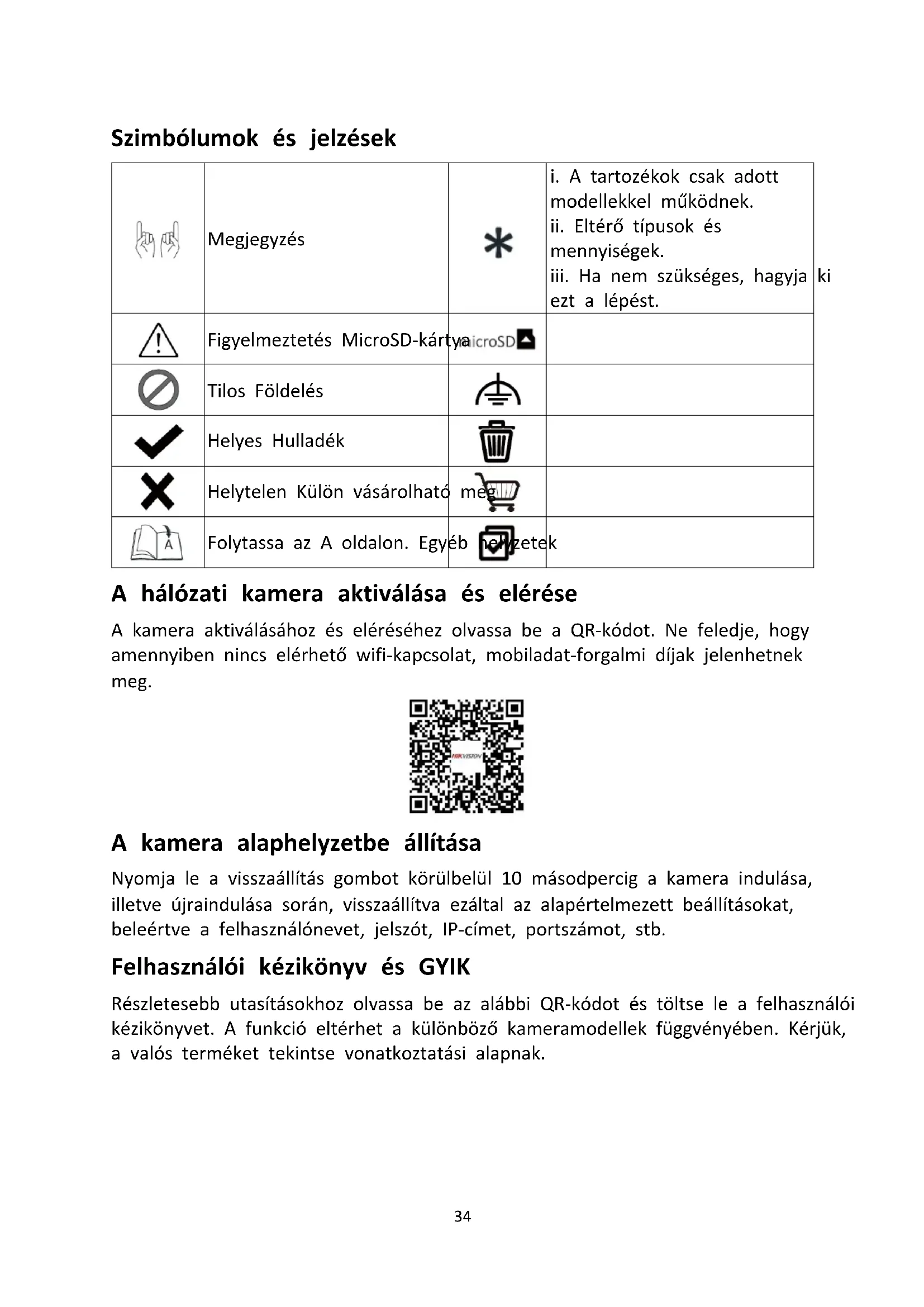 ezt a lépést. Figyelmeztetés MicroSD-kártya Tilos Földelés Helyes Hulladék Helytelen Külön vásárolható meg Folytassa az A oldalon. Egyéb helyzetek A hálózati kamera aktiválása és elérése A kamera aktiválásához és eléréséhez olvassa be a QR-kódot. Ne feledje, hogy amennyiben nincs elérhető wifi-kapcsolat, mobiladat-forgalmi díjak jelenhetnek meg. A kamera alaphelyzetbe állítása Nyomja le a visszaállítás gombot körülbelül 10 másodpercig a kamera indulása, illetve újraindulása során, visszaállítva ezáltal az alapértelmezett beállításokat, beleértve a felhasználónevet, jelszót, IP-címet, portszámot, stb. Felhasználói kézikönyv és GYIK Részletesebb utasításokhoz olvassa be az alábbi QR-kódot és töltse le a felhasználói kézikönyvet. A funkció eltérhet a különböző kameramodellek függvényében. Kérjük, a valós terméket tekintse vonatkoztatási alapnak.35 Cső kialakítású hálózati hőkamera Két spektrumú hálózati csőkamera GYIK Jogszabályi megfelelőség és biztonsági információk A készülék használata előtt figyelmesen olvassa el a jelen dokumentumban található összes információt és utasítást, és őrizze meg azokat jövőbeni referenciaként. A készülékkel kapcsolatos további információkért és utasításokért kérjük, látogasson el weboldalunkra: https://www.hikvision.com. További információkért tanulmányozza a készülékhez mellékelt egyéb dokumentumokat (ha van ilyen), vagy olvassa be a csomagoláson található QR-kódot (ha van ilyen). Felelősségkizárás EZT A KÉZIKÖNYVET, VALAMINT A BENNE SZEREPLŐ TERMÉKET ANNAK HARDVER-,