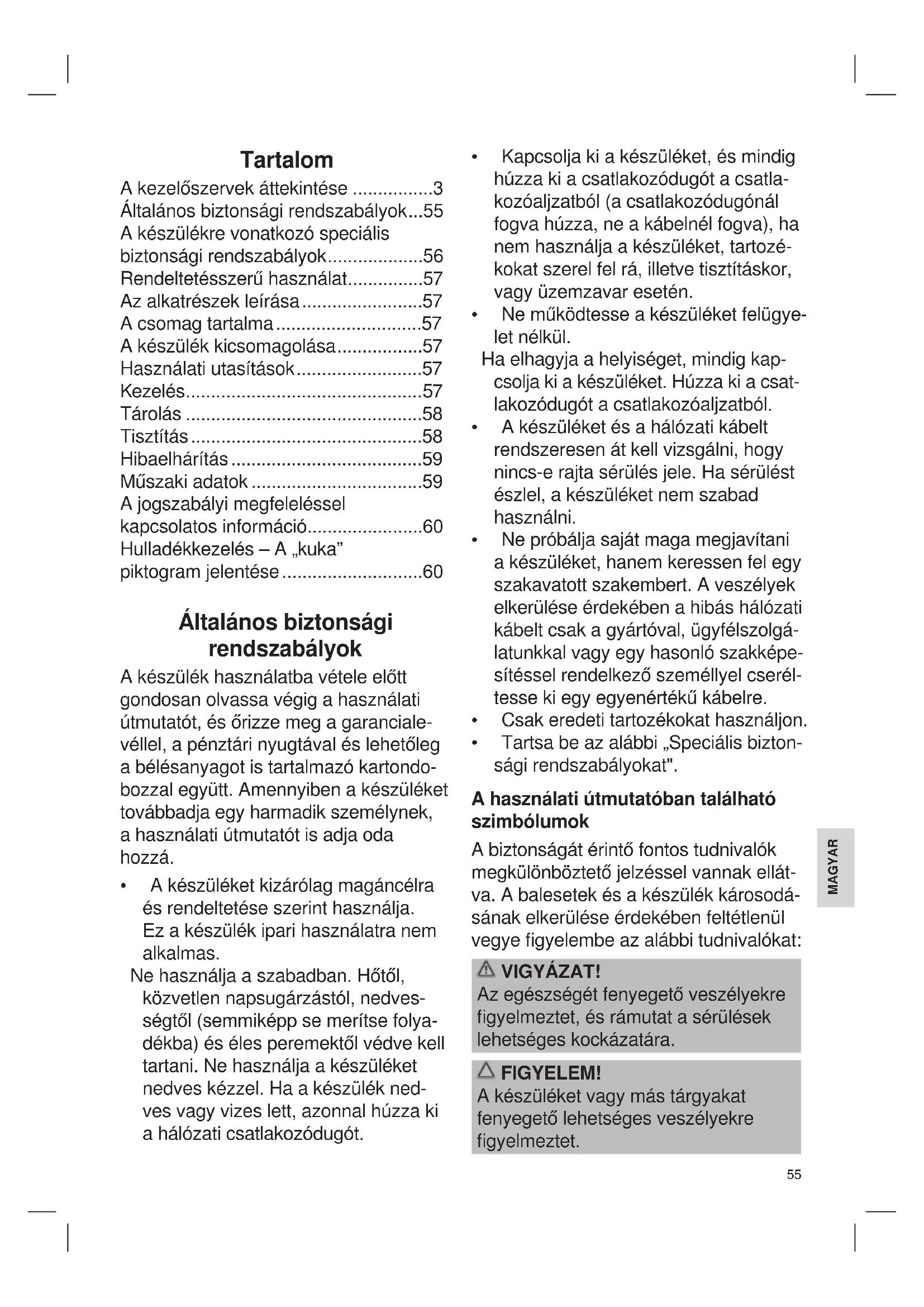 - Tartsabeazalábbi„Speciálisbizton- sági rendszabályokat". A használati útmutatóban található szimbólumok A biztonságát érintő fontos tudnivalók megkülönböztető jelzéssel vannak ellát- va. A balesetek és a készülék károsodá- sának elkerülése érdekében feltétlenül vegye figyelembe az alábbi tudnivalókat: VIGYÁZAT! Az egészségét fenyegető veszélyekre figyelmeztet, és rámutat a sérülések lehetséges kockázatára. FIGYELEM! A készüléket vagy más tárgyakat fenyegető lehetséges veszélyekre figyelmeztet.56 MAGYAR MEGJEGYZÉS: Tippeket és információkat emel ki az Ön számára. Gyerekek és rossz egészségi állapotú személyek