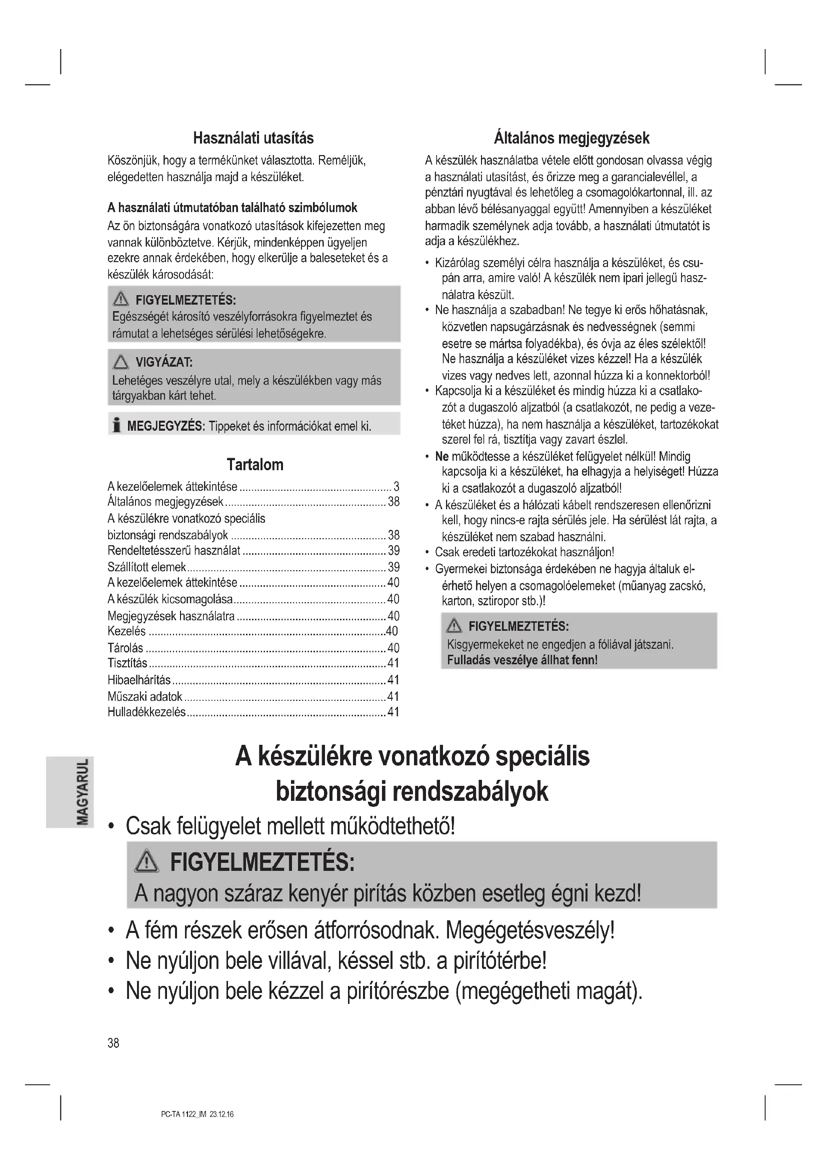 - Usuwanie Znaczenie symbolu „Pojemnik na śmieci“ Proszę oszczędzać nasze środowisko, sprzęt elektryczny nie należy do śmieci domowych. Proszę korzystać z punktów zbiorczych, przewi- dzianych do zdawania sprzętu elektrycznego, i tam proszę oddawać sprzęt elektryczny, którego już nie będą Państwo używać. Tym sposobem pomagają Państwo unikać potencjalnych następstw niewłaściwego usuwania odpadów, mających wpływ na środowisko i zdrowie ludzi. Tą drogą przyczyniają się Państwo do ponownego użycia, do recyklingu i do innych form wykorzystania starego sprzętu elektrycznego i elektronicznego. Informacje, gdzie można zdać sprzęt, otrzymają Państwo w swoich urzędach komunalnych lub w administracji gminy.38 PC-TA 1122_IM 23.12.16 Használati utasítás Köszönjük, hogy a termékünket választotta. Reméljük, elégedetten használja majd a készüléket. A használati útmutatóban található szimbólumok Az ön biztonságára vonatkozó utasítások kifejezetten meg vannak különböztetve. Kérjük, mindenképpen ügyeljen ezekre annak érdekében, hogy elkerülje a baleseteket és a készülék károsodását: FIGYELMEZTETÉS: Egészségét károsító veszélyforrásokra gyelmeztet és rámutat a lehetséges sérülési lehetőségekre. VIGYÁZAT: Lehetéges veszélyre utal, mely a készülékben vagy más tárgyakban kárt tehet. MEGJEGYZÉS: Tippeket és információkat emel ki. Tartalom A kezelőelemek áttekintése p. 3