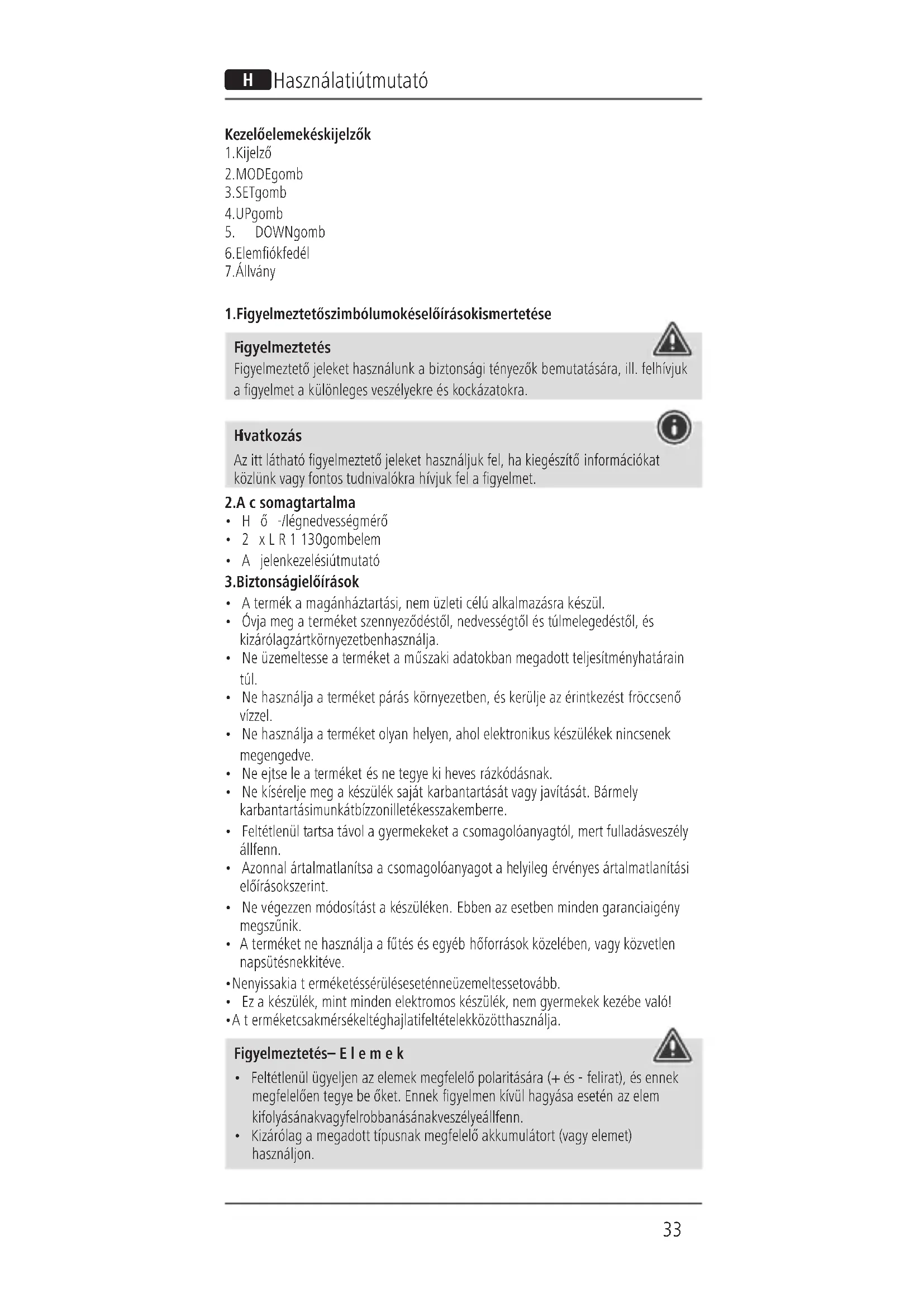 - Aterméket csak mérsékelt éghajlati feltételek között használja. Figyelmeztetés –Elemek