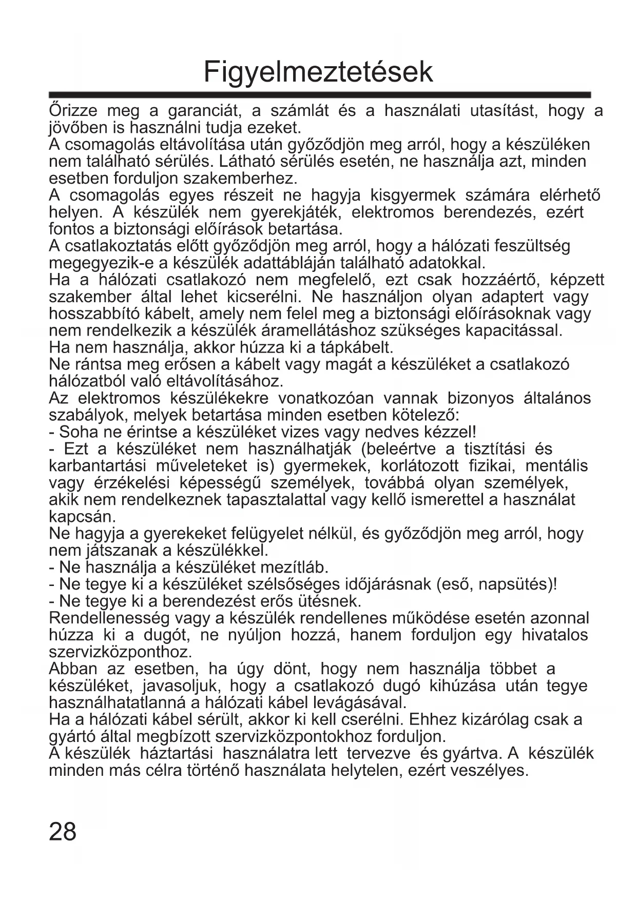 ALATT, VAGY NEM KAPTAK TÁJÉKOZTATÁST A BIZTONSÁGOS HASZNÁLATTAL KAPCSOLATBAN, ÉS MEG NEM ÉRTETTÉK A VONATKOZÓ VESZÉLYEKET. GYERMEKEK NEM JÁTSZHATNAK A KÉSZÜLÉKKEL. KARBANTARTÁST ÉS A TISZTÍTÁST NEM VÉGEZHETIK GYERMEKEK, KIVÉVE, HA A GYERMEKEK BETÖLTÖTTÉK 8. ÉLETÉVÜKET ÉS FELÜGYELET ALATT VANNAK. TARTSA A KÉSZÜLÉKET ÉS A TÁPKÁBELT 8 ÉVESNÉL FIATALABB GYERMEKEK ÁLTAL NEM ELÉRHETŐ HELYEN. A FELÜLETEK HŐMÉRSÉKLETE MAGAS LEHET, MIKÖZBEN A KÉSZÜLÉK MŰKÖDÉSBEN VAN. HASZNÁLAT SORÁN A FELÜLETEK FELFORRÓSODHATNAK. 27Őrizze meg a garanciát, a számlát és a használati utasítást, hogy a jövőben is használni tudja ezeket. A csomagolás eltávolítása után győződjön meg arról, hogy a készüléken nem található sérülés. Látható sérülés esetén, ne használja azt, minden esetben forduljon szakemberhez. A csomagolás egyes részeit ne hagyja kisgyermek számára elérhető helyen. A készülék nem gyerekjáték, elektromos berendezés, ezért fontos a biztonsági előírások betartása. A csatlakoztatás előtt győződjön meg arról, hogy a hálózati feszültség megegyezik-e a készülék adattábláján található adatokkal. Ha a hálózati csatlakozó nem megfelelő, ezt csak hozzáértő, képzett szakember által lehet kicserélni. Ne használjon olyan adaptert vagy hosszabbító kábelt, amely nem felel meg a biztonsági előírásoknak vagy nem rendelkezik a készülék áramellátáshoz szükséges kapacitással. Ha nem használja, akkor húzza ki a tápkábelt. Ne rántsa meg erősen a kábelt vagy magát a készüléket a csatlakozó hálózatból való eltávolításához. Az elektromos készülékekre vonatkozóan vannak bizonyos általános szabályok, melyek betartása minden esetben kötelező: - Soha ne érintse a készüléket vizes vagy nedves kézzel! - Ezt a készüléket nem használhatják (beleértve a tisztítási és karbantartási műveleteket is) gyermekek, korlátozott zikai, mentális vagy érzékelési képességű személyek, továbbá olyan személyek, akik nem rendelkeznek tapasztalattal vagy kellő ismerettel a használat kapcsán. Ne hagyja a gyerekeket felügyelet nélkül, és győződjön meg arról, hogy nem játszanak a készülékkel. - Ne használja a készüléket mezítláb. - Ne tegye ki a készüléket szélsőséges időjárásnak (eső, napsütés)! - Ne tegye ki a berendezést erős ütésnek. Rendellenesség vagy a készülék rendellenes működése esetén azonnal húzza ki a dugót, ne nyúljon hozzá, hanem forduljon egy hivatalos szervizközponthoz. Abban az esetben, ha úgy dönt, hogy nem használja többet a készüléket, javasoljuk, hogy a csatlakozó dugó kihúzása után tegye használhatatlanná a hálózati kábel levágásával. Ha a hálózati kábel sérült, akkor ki kell cserélni. Ehhez kizárólag csak a gyártó által megbízott szervizközpontokhoz forduljon. A készülék háztartási használatra lett tervezve és gyártva. A készülék minden más célra történő használata helytelen, ezért veszélyes. Figyelmeztetések 28A készüléket ne használja a szabadban. Biztonsági okok miatt a készüléket tilos kinyitni. Ne helyezze a készüléket nem megfelelő és nem hőálló felületre. Tartsa távol a készüléket a gyermekektől és fogyatékos személyektől, mert a lemez forró lehet. A felületek hőmérséklete magas lehet, miközben a készülék működésben van. A készülék nem működtethető külső időzítővel vagy külön távirányítóval. Mielőtt visszatenné a dobozába, várja meg, hogy a melegítőhenger teljesen lehűljön. A melegítőhenger nagyon forró lehet és felmelegíti az edényben lévő vizet. Használjon egy lábasalátétet, hogy megvédje a munkalapot a készülékkel használt bármilyen edénytől. Használjon csipeszt a vízben lévő tárgyak eléréséhez. Különösen óvatosan járjon el a forró vizet tartalmazó edények mozgatásakor. Műszaki adatok