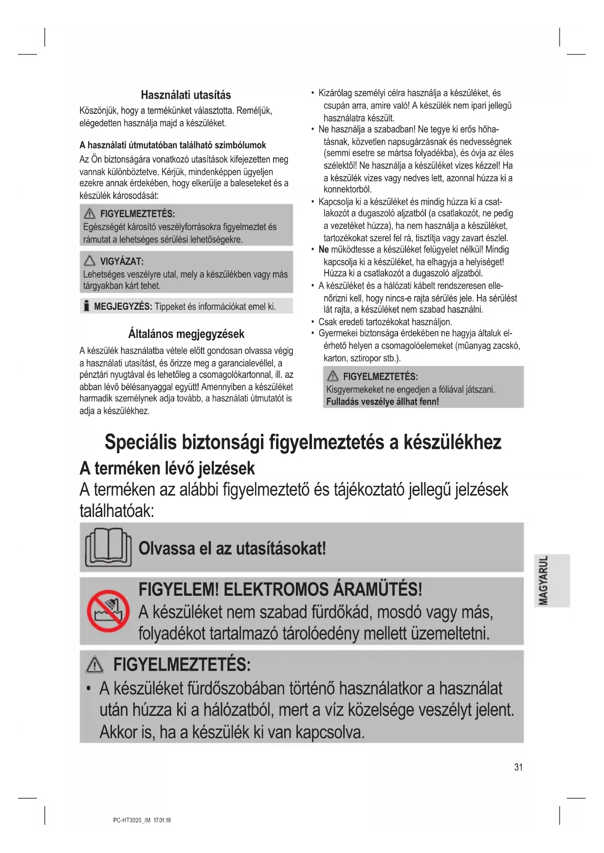 - A készüléket fürdőszobában történő használatkor a használat után húzza ki a hálózatból, mert a víz közelsége veszélyt jelent. Akkor is, ha a készülék ki van kapcsolva.32 PC-HT3020_IM 17.01.18 FIGYELMEZTETÉS: