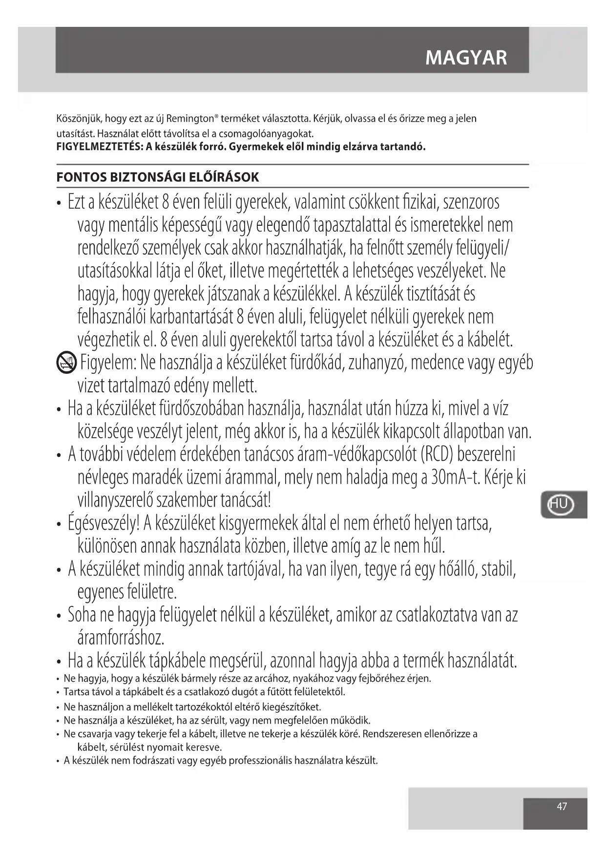 Az alábbi jelölések valamelyikével ellátott készülékekben, valamint újratölthető és nem újratölthető akkumulátorokban jelen lévő veszélyes anyagok jelentette környezeti és egészségi kockázatok elkerülése érdekében ezeket tilos a háztartási hulladékkal együtt megsemmisíteni. Az elektromos és elektronikus termékeket, és, ha vannak, az újratölthető és nem újratölthető akkumulátorokat mindig a megfelelő hivatalos hulladék-újrahasznosító/begyűjtő központba kell vinni.50 Выпрямитель электрический для волос Спасибо за покупку нового изделия Remington®. Перед использованием внимательно ознакомьтесь с инструкцией и сохраните ее. Перед применением изделия снимите с него упаковку. ПРЕДУПРЕЖДЕНИЕ: прибор горячий. Всегда храните в недоступном для детей месте. ВАЖНЫЕ МЕРЫ БЕЗОПАСНОСТИ