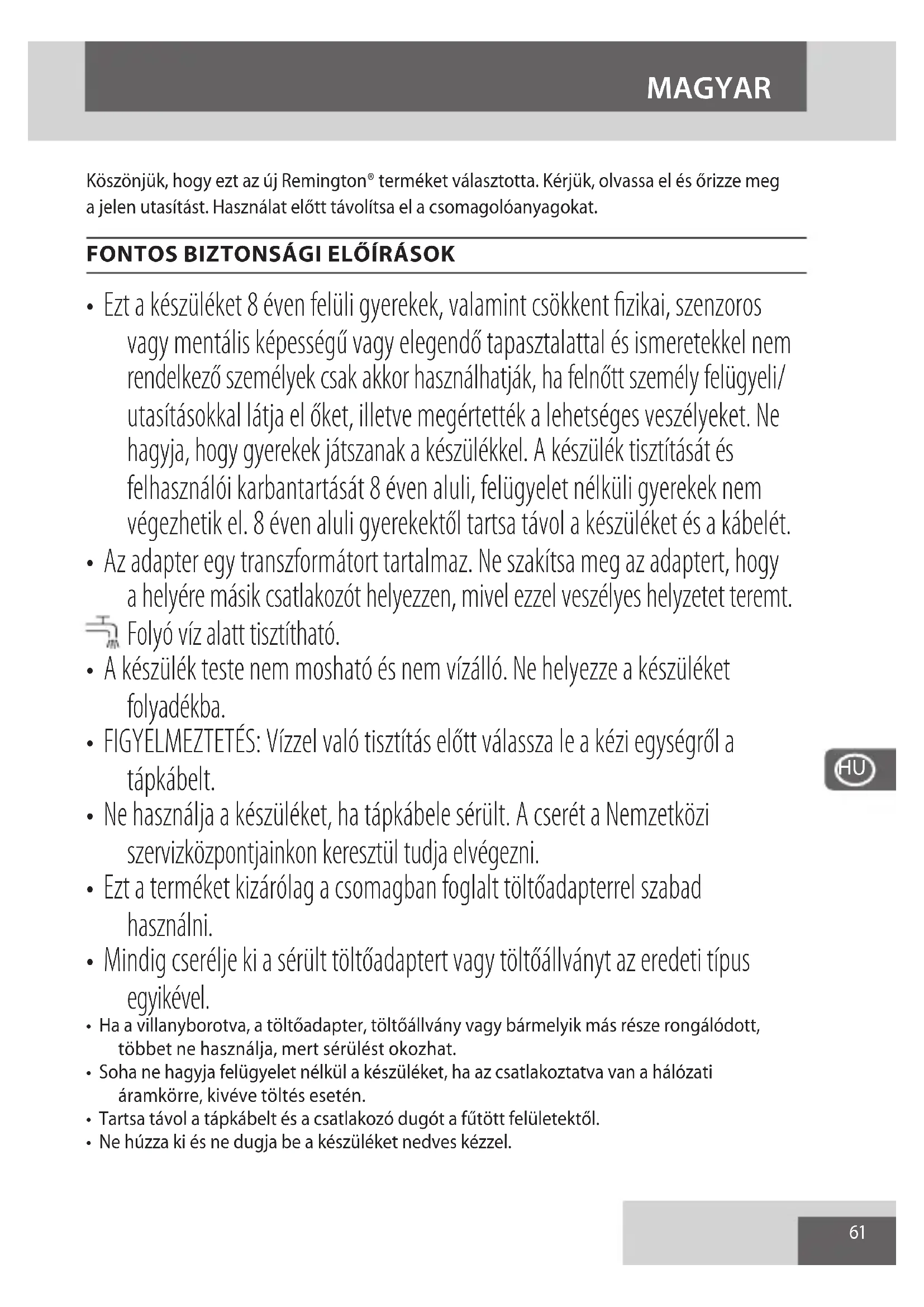 - Ezt a készüléket 8 éven felüli gyerekek, valamint csökkent fizikai, szenzoros vagy mentális képességű vagy elegendő tapasztalattal és ismeretekkel nem rendelkező személyek csak akkor használhatják, ha felnőtt személy felügyeli/ utasításokkal látja el őket, illetve megértették a lehetséges veszélyeket. Ne hagyja, hogy gyerekek játszanak a készülékkel. A készülék tisztítását és felhasználói karbantartását 8 éven aluli, felügyelet nélküli gyerekek nem végezhetik el. 8 éven aluli gyerekektől tartsa távol a készüléket és a kábelét.
