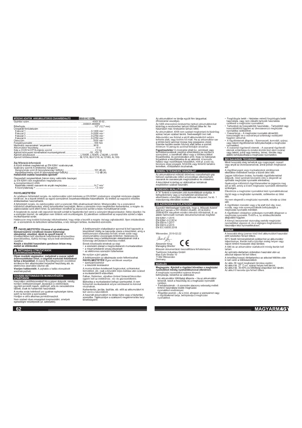 - a készülék lerakásakor A munka közben keletkezett forgácsokat, szilkánkokat, törmeléket, stb. csak a készülék teljes leállása után szabad a munkaterületről eltávolítani. Falban, födémben, aljzatban történő fúrásnál fokozottan ügyelni kell az elektromos-, víz- és gázvezetékekre. Biztosítsa a munkadarabot befogó szerkezettel. A nem biztosított munkadarabok súlyos sérüléseket és károkat okozhatnak. Karbantartás, javítás, tisztítás, stb. előtt az akkumulátort ki kell venni a készülékből. A használt akkumulátort ne dobja tűzbe vagy a háztartási szemétbe. Tájékozódjon a szakszerű megsemmisítés helyi lehetőségeiről. FIGYELMEZTETÉS! Az adatlapon feltüntetett rezgés- és zajkibocsátási szint mérésére az EN 62841 szabványos vizsgálati módszere alapján került sor, és a kapott értékek az egyes szerszámok összehasonlítására használhatók. Az értékek az expozíció előzetes értékelésében használhatók. A feltüntetett rezgés- és zajkibocsátási szint a szerszám főbb alkalmazásait tükrözi. Mindazonáltal, ha a szerszámot különböző alkalmazásokra, eltérő tartozékokkal használják, illetve a szerszám nincs megfelelően karbantartva, a rezgés- és zajkibocsátási szint eltérő lehet. Ez jelentősen növelheti az expozíciós szintet a teljes munkafolyamat során. A rezgésnek és zajnak való expozíció becsült szintjét is fi gyelembe kell venni a szerszám kikapcsolásakor, illetve olyankor, ha a szerszám üzemel, de valójában nem történik vele munkavégzés. Ez jelentősen csökkentheti az expozíciós szintet a teljes munkafolyamat során. Határozzon meg további biztonsági intézkedéseket, hogy védje a kezelőt a rezgés- és/vagy zajhatásoktól. Ilyen intézkedések pl.: a szerszámok és tartozékok karbantartása, a kéz melegen tartása, munkarend-szervezés.6564