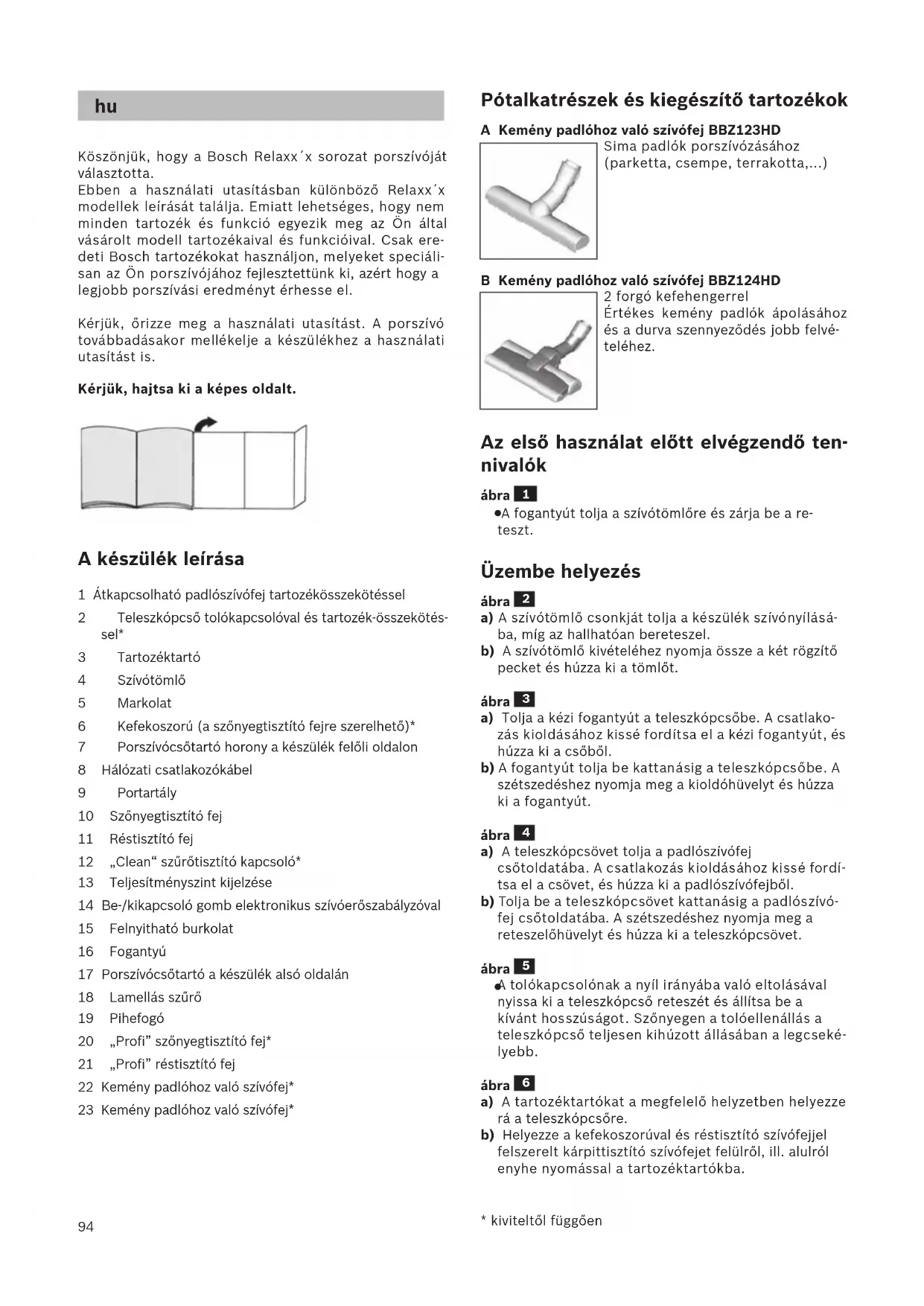 Köszönjük, hogy a Bosch Relaxx´x sorozat porszívóját választotta. Ebben a használati utasításban különböző Relaxx´x modellek leírását találja. Emiatt lehetséges, hogy nem minden tartozék és funkció egyezik meg az Ön által vásárolt modell tartozékaival és funkcióival. Csak ere- deti Bosch tartozékokat használjon, melyeket speciáli- san az Ön porszívójához fejlesztettünk ki, azért hogy a legjobb porszívási eredményt érhesse el. Kérjük, őrizze meg a használati utasítást. A porszívó továbbadásakor mellékelje a készülékhez a használati utasítást is. Kérjük, hajtsa ki a képes oldalt. A készülék leírása 1 Átkapcsolható padlószívófej tartozékösszekötéssel 2 Teleszkópcső tolókapcsolóval és tartozék-összekötés- sel* 3 Tartozéktartó 4 Szívótömlő 5 Markolat 6 Kefekoszorú (a szőnyegtisztító fejre szerelhető)* 7 Porszívócsőtartó horony a készülék felőli oldalon 8 Hálózati csatlakozókábel 9 Portartály 10 Szőnyegtisztító fej 11 Réstisztító fej 12 „Clean“ szűrőtisztító kapcsoló* 13 Teljesítményszint kijelzése 14 Be-/kikapcsoló gomb elektronikus szívóerőszabályzóval 15 Felnyitható burkolat 16 Fogantyú 17 Porszívócsőtartó a készülék alsó oldalán 18 Lamellás szűrő 19 Pihefogó 20 „Profi” szőnyegtisztító fej* 21 „Profi” réstisztító fej 22 Kemény padlóhoz való szívófej* 23 Kemény padlóhoz való szívófej*