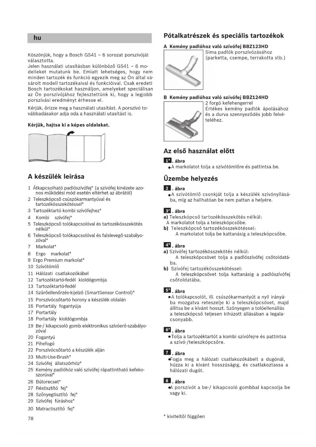 Köszönjük, hogy a Bosch GS41 – 6 sorozat porszívóját választotta. Jelen használati utasításban különböző GS41 – 6 mo- delleket mutatunk be. Emiatt lehetséges, hogy nem minden tartozék és funkció egyezik meg az Ön által vá- sárolt modell tartozékaival és funkcióival. Csak eredeti Bosch tartozékokat használjon, amelyeket speciálisan az Ön porszívójához fejlesztettünk ki, hogy a legjobb porszívási eredményt érhesse el. Kérjük, őrizze meg a használati utasítást. A porszívó to- vábbadásakor adja oda a használati utasítást is. Kérjük, hajtsa ki a képes oldalakat. A készülék leírása 1 Átkapcsolható padlószívófej* (a szívófej kinézete azo- nos működési mód esetén eltérhet az ábrától) 2 Teleszkópcső csúszókarmantyúval és tartozékösszekötéssel* 3 Tartozéktartó kombi szívófejhez* 4 Kombi szívófej* 5 Teleszkópcső tolókapcsolóval és tartozékösszekötés nélkül* 6 Teleszkópcső tolókapcsolóval és falslevegő-szabályo- zóval* 7 Markolat* 8 Ergo markolat* 9 Ergo Premium markolat* 10 Szívótömlő 11 Hálózati csatlakozókábel 12 Tartozéktartó-fedél kioldógombja 13 Tartozéktartó-fedél 14 Szűrőellenőrzés-kijelző (SmartSensor Control)* 15 Porszívócsőtartó horony a készülék oldalán 16 Portartály fogantyúja 17 Portartály 18 Portartály kioldógombja 19 Be-/ kikapcsoló gomb elektronikus szívóerő-szabályo- zóval 20 Fogantyú 21 Pihefogó 22 Porszívócsőtartó a készülék alján 23 Multi-Use-Brush* 24 Szívófej állatszőrhöz* 25 Kemény padlóhóz való szívófej rápattintható kefeko- szorúval* 26 Bútorecset* 27 Réstisztító fej* 28 Szőnyegtisztító fej* 29 Szívófej fúráshoz* 30 Matractisztító fej*