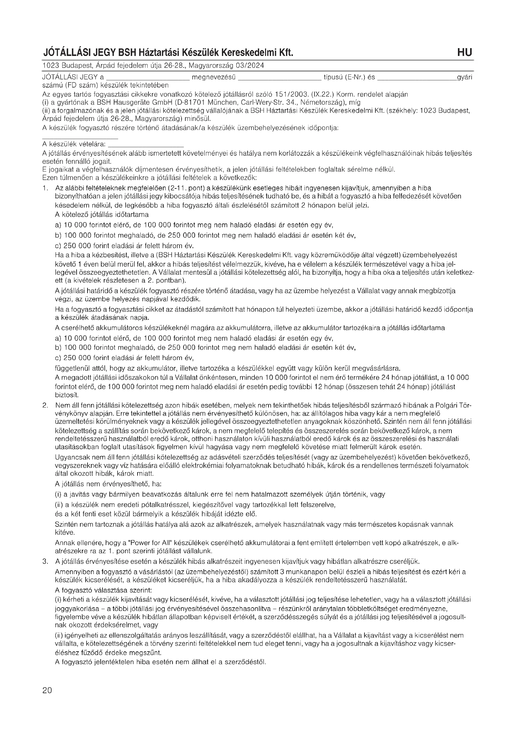 1023 Budapest, Árpád fejedelem útja 26-28., Magyarország 03/2024 JÓTÁLLÁSI JEGY a ______________________ megnevezésű ______________________ típusú (E-Nr.) és _____________________gyári számú (FD szám) készülék tekintetében Az egyes tartós fogyasztási cikkekre vonatkozó kötelező jótállásról szóló 151/2003. (IX.22.) Korm. rendelet alapján (i) a gyártónak a BSH Hausgeräte GmbH (D-81701 München, Carl-Wery-Str. 34., Németország), míg (ii) a forgalmazónak és a jelen jótállási kötelezettség vállalójának a BSH Háztartási Készülék Kereskedelmi Kft. (székhely: 1023 Budapest, Árpád fejedelem útja 26-28., Magyarország) minősül. A készülék fogyasztó részére történő átadásának/a készülék üzembehelyezésének időpontja: