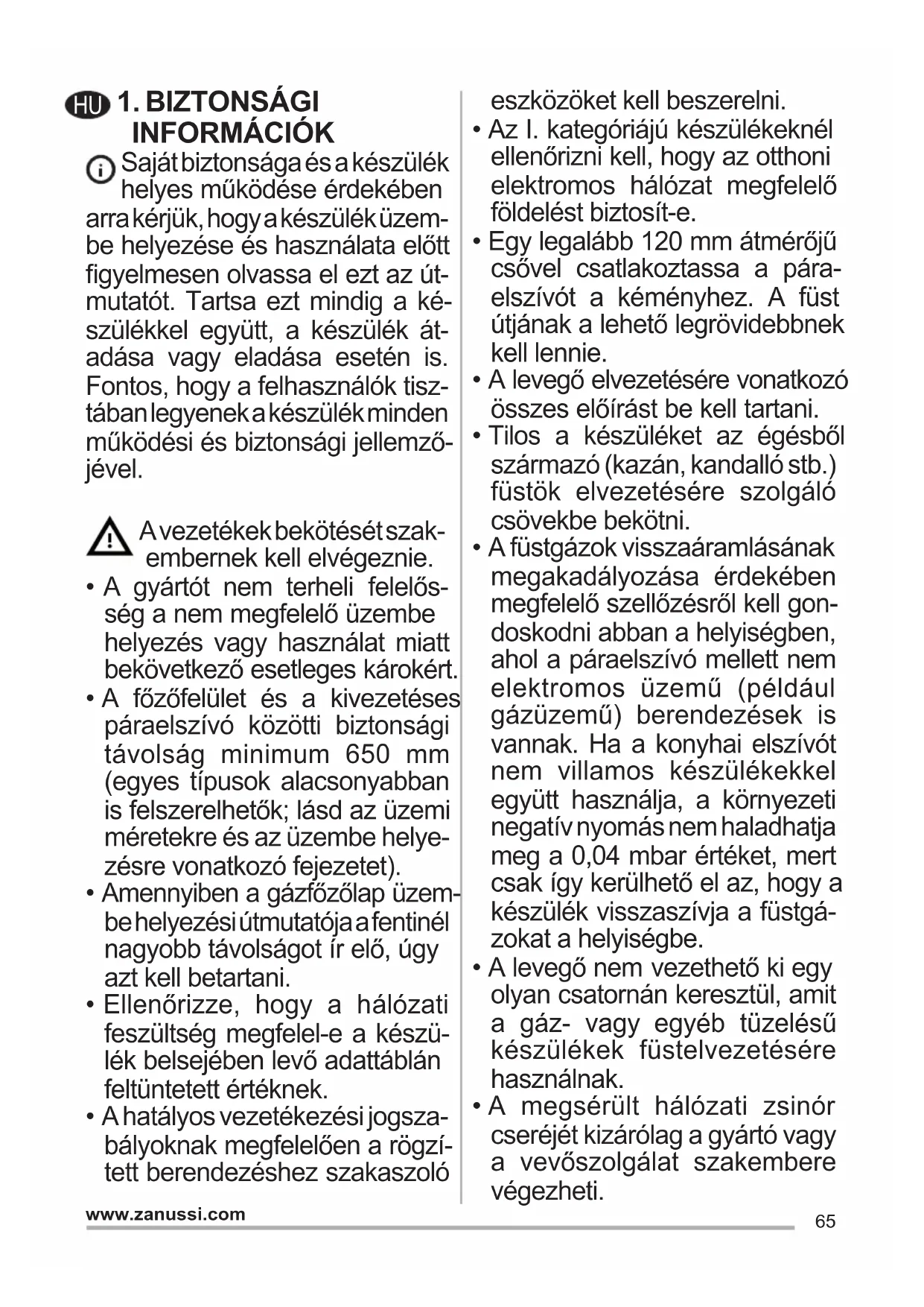 - A megsérült hálózati zsinór cseréjét kizárólag a gyártó vagy a vevőszolgálat szakembere végezheti. HU66 www.zanussi.com