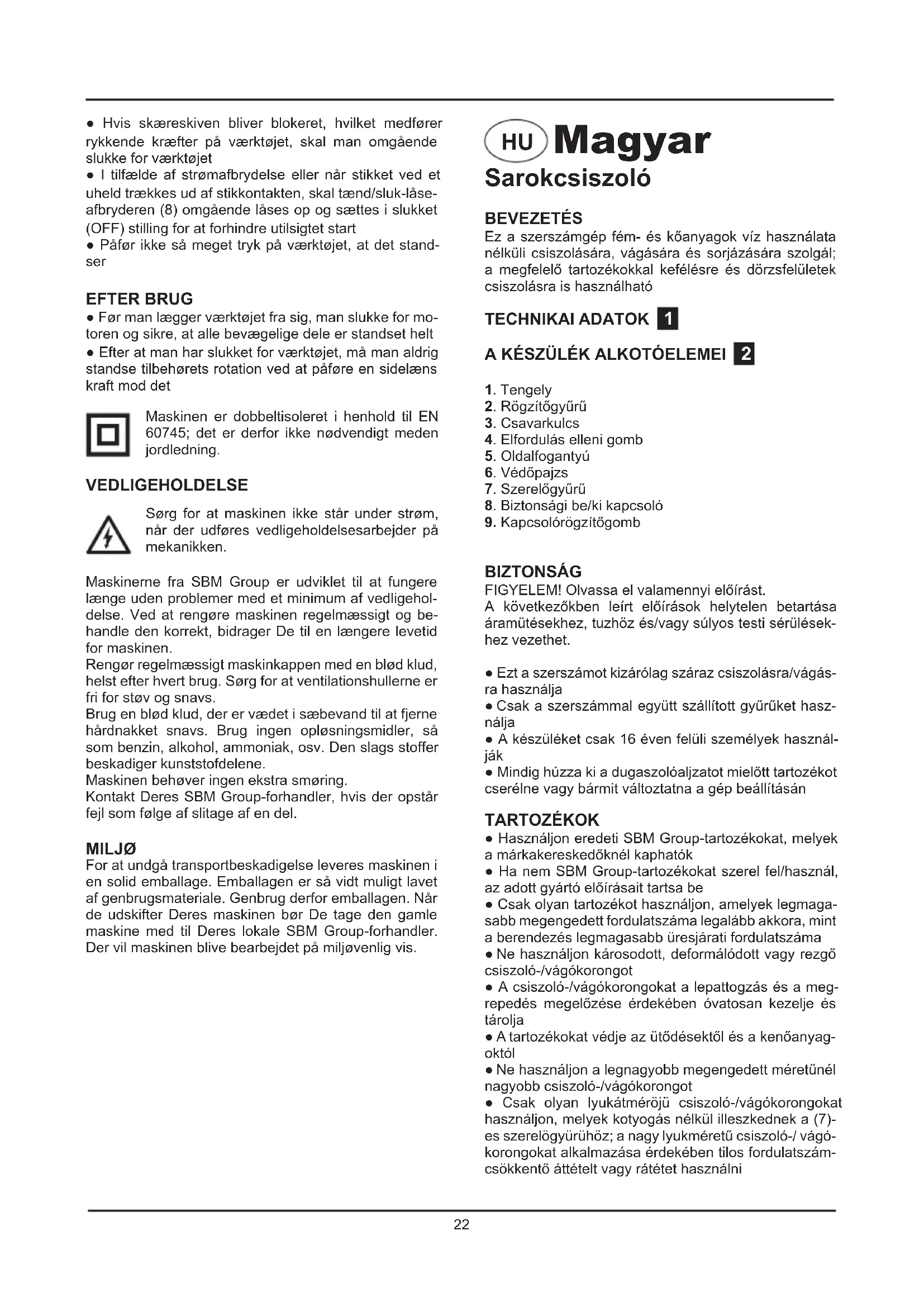 Magyar Sarokcsiszoló BEVEZETÉS Ez a szerszámgép fém- és kőanyagok víz használata nélküli csiszolására, vágására és sorjázására szolgál; a megfelelő tartozékokkal kefélésre és dörzsfelületek csiszolásra is használható TECHNIKAI ADATOK 1 A KÉSZÜLÉK ALKOTÓELEMEI 2 1. Tengely2. Rögzítőgyűrű3. Csavarkulcs4. Elfordulás elleni gomb5. Oldalfogantyú6. Védőpajzs7. Szerelőgyűrű8. Biztonsági be/ki kapcsoló9. Kapcsolórögzítőgomb BIZTONSÁG FIGYELEM! Olvassa el valamennyi előírást. A következőkben leírt előírások helytelen betartása áramütésekhez, tuzhöz és/vagy súlyos testi sérülések-hez vezethet. ● Ezt a szerszámot kizárólag száraz csiszolásra/vágás-ra használja ● Csak a szerszámmal együtt szállított gyűrűket hasz- nálja● A készüléket csak 16 éven felüli személyek használ- ják ● Mindig húzza ki a dugaszolóaljzatot mielőtt tartozékot cserélne vagy bármit változtatna a gép beállításán TARTOZÉKOK ● Használjon eredeti SBM Group-tartozékokat, melyek a márkakereskedőknél kaphatók● Ha nem SBM Group-tartozékokat szerel fel/használ, az adott gyártó előírásait tartsa be● Csak olyan tartozékot használjon, amelyek legmaga-sabb megengedett fordulatszáma legalább akkora, mint a berendezés legmagasabb üresjárati fordulatszáma ● Ne használjon károsodott, deformálódott vagy rezgő csiszoló-/vágókorongot● A csiszoló-/vágókorongokat a lepattogzás és a meg-repedés megelőzése érdekében óvatosan kezelje és tárolja ● A tartozékokat védje az ütődésektől és a kenőanyag- októl ● Ne használjon a legnagyobb megengedett méretűnél nagyobb csiszoló-/vágókorongot● Csak olyan lyukátméröjü csiszoló-/vágókorongokat használjon, melyek kotyogás nélkül illeszkednek a (7)-es szerelögyürühöz; a nagy lyukméretű csiszoló-/ vágó-korongokat alkalmazása érdekében tilos fordulatszám-csökkentő áttételt vagy rátétet használni● Hvis skæreskiven bliver blokeret, hvilket medfører rykkende kræfter på værktøjet, skal man omgående slukke for værktøjet● I tilfælde af strømafbrydelse eller når stikket ved et uheld trækkes ud af stikkontakten, skal tænd/sluk-låse-afbryderen (8) omgående låses op og sættes i slukket (OFF) stilling for at forhindre utilsigtet start● Påfør ikke så meget tryk på værktøjet, at det stand- ser EFTER BRUG ● Før man lægger værktøjet fra sig, man slukke for mo-toren og sikre, at alle bevægelige dele er standset helt● Efter at man har slukket for værktøjet, må man aldrig standse tilbehørets rotation ved at påføre en sidelæns kraft mod det Maskinen er dobbeltisoleret i henhold til EN 60745; det er derfor ikke nødvendigt meden jordledning. VEDLIGEHOLDELSE Sørg for at maskinen ikke står under strøm, når der udføres vedligeholdelsesarbejder på mekanikken.Maskinerne fra SBM Group er udviklet til at fungere længe uden problemer med et minimum af vedligehol-delse. Ved at rengøre maskinen regelmæssigt og be-handle den korrekt, bidrager De til en længere levetid for maskinen.Rengør regelmæssigt maskinkappen med en blød klud, helst efter hvert brug. Sørg for at ventilationshullerne er fri for støv og snavs.Brug en blød klud, der er vædet i sæbevand til at fjerne hårdnakket snavs. Brug ingen opløsningsmidler, så som benzin, alkohol, ammoniak, osv. Den slags stoffer beskadiger kunststofdelene.Maskinen behøver ingen ekstra smøring.Kontakt Deres SBM Group-forhandler, hvis der opstår fejl som følge af slitage af en del. MILJØ For at undgå transportbeskadigelse leveres maskinen i en solid emballage. Emballagen er så vidt muligt lavet af genbrugsmateriale. Genbrug derfor emballagen. Når de udskifter Deres maskinen bør De tage den gamle maskine med til Deres lokale SBM Group-forhandler. Der vil maskinen blive bearbejdet på miljøvenlig vis.23 ● Ha a vágókorong elakad, és emiatt rángat a szer- szám, azonnal kapcsolja ki ● Ha áramszünet következik be, vagy ha a dugós csat- lakozót véletlenül kihúzza, a gép akaratlan újraindításá- nak megelőzésére azonnal oldja fel a be/ki kapcsoló (8) zárolását, és állítsa a kapcsolót a KI állásba ● Soha ne fejtsen ki akkora nyomást a gépre, hogy az megálljon