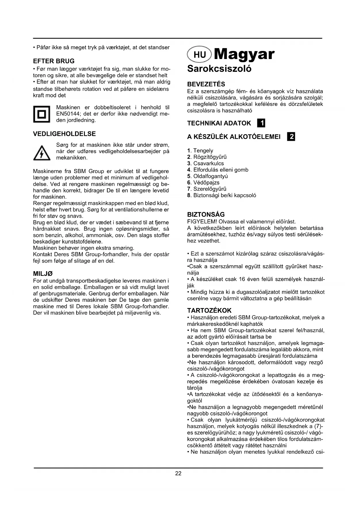 - Før man lægger værktøjet fra sig, man slukke for mo-toren og sikre, at alle bevægelige dele er standset helt• Efter at man har slukket for værktøjet, må man aldrig standse tilbehørets rotation ved at påføre en sidelæns kraft mod det Maskinen er dobbeltisoleret i henhold til EN50144; det er derfor ikke nødvendigt me-den jordledning. VEDLIGEHOLDELSE Sørg for at maskinen ikke står under strøm, når der udføres vedligeholdelsesarbejder på mekanikken.Maskinerne fra SBM Group er udviklet til at fungere længe uden problemer med et minimum af vedligehol-delse. Ved at rengøre maskinen regelmæssigt og be-handle den korrekt, bidrager De til en længere levetid for maskinen.Rengør regelmæssigt maskinkappen med en blød klud, helst efter hvert brug. Sørg for at ventilationshullerne er fri for støv og snavs.Brug en blød klud, der er vædet i sæbevand til at fjerne hårdnakket snavs. Brug ingen opløsningsmidler, så som benzin, alkohol, ammoniak, osv. Den slags stoffer beskadiger kunststofdelene.Maskinen behøver ingen ekstra smøring.Kontakt Deres SBM Group-forhandler, hvis der opstår fejl som følge af slitage af en del. MILJØ For at undgå transportbeskadigelse leveres maskinen i en solid emballage. Emballagen er så vidt muligt lavet af genbrugsmateriale. Genbrug derfor emballagen. Når de udskifter Deres maskinen bør De tage den gamle maskine med til Deres lokale SBM Group-forhandler. Der vil maskinen blive bearbejdet på miljøvenlig vis.23 azonnal kapcsolja ki