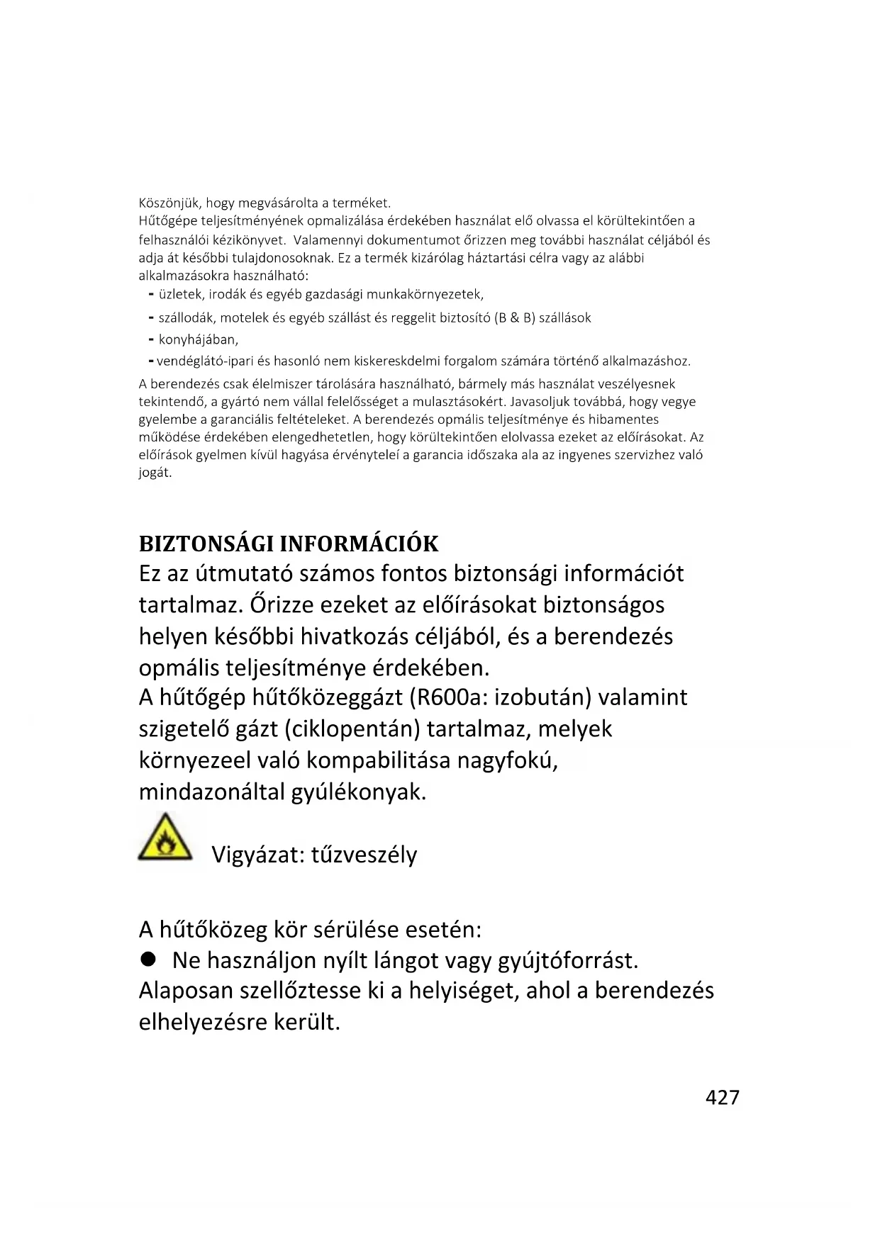 Köszönjük, hogy megvásárolta a terméket. Hűtőgépe teljesítményének optimalizálása érdekében használat előtt olvassa el körültekintően a felhasználói kézikönyvet. Valamennyi dokumentumot őrizzen meg további használat céljából és adja át későbbi tulajdonosoknak. Ez a termék kizárólag háztartási célra vagy az alábbi alkalmazásokra használható: - üzletek, irodák és egyéb gazdasági munkakörnyezetek, - szállodák, motelek és egyéb szállást és reggelit biztosító (B & B) szállások - konyhájában, - vendéglátó-ipari és hasonló nem kiskereskdelmi forgalom számára történő alkalmazáshoz. A berendezés csak élelmiszer tárolására használható, bármely más használat veszélyesnek tekintendő, a gyártó nem vállal felelősséget a mulasztásokért. Javasoljuk továbbá, hogy vegye figyelembe a garanciális feltételeket. A berendezés optimális teljesítménye és hibamentes működése érdekében elengedhetetlen, hogy körültekintően elolvassa ezeket az előírásokat. Az előírások figyelmen kívül hagyása érvényteleíti a garancia időszaka alatt az ingyenes szervizhez való jogát.