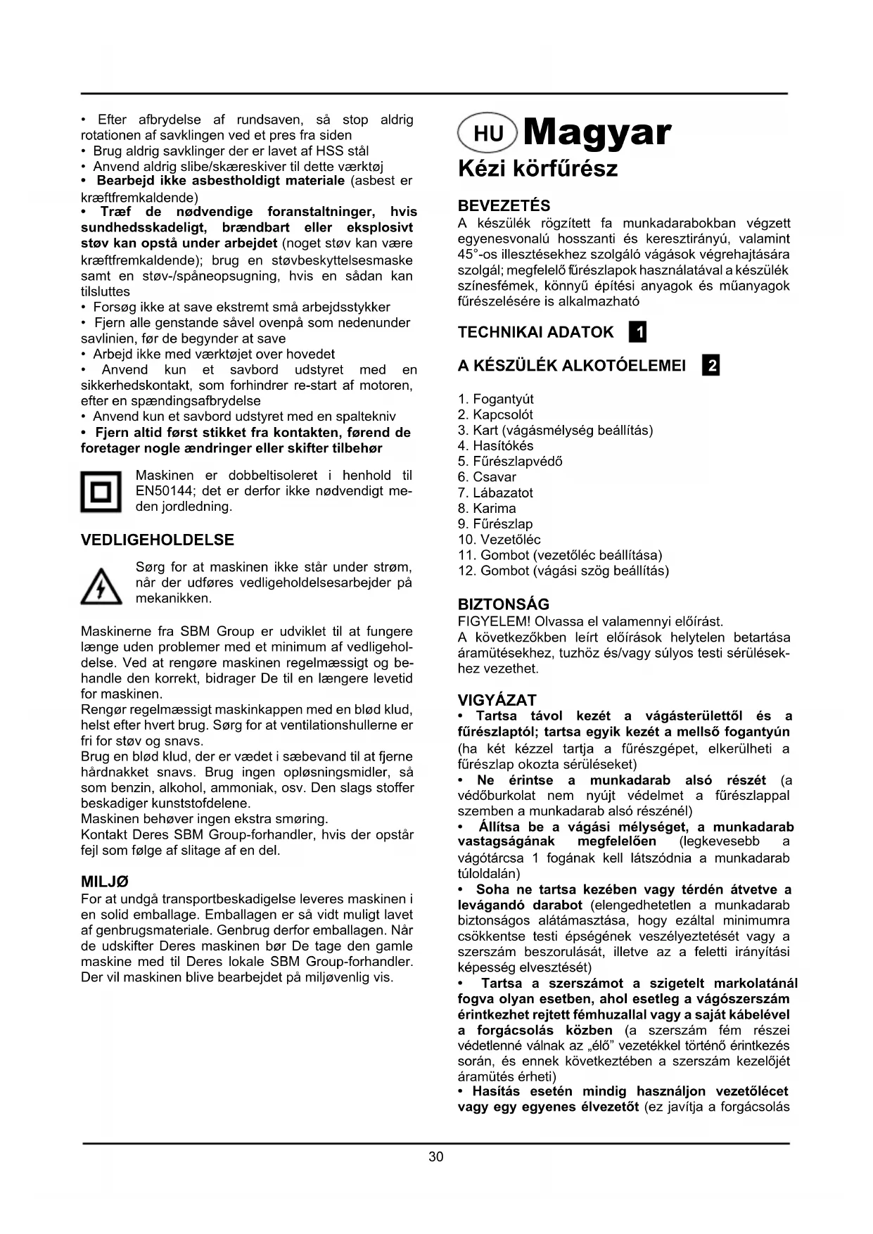 - Efter afbrydelse af rundsaven, så stop aldrig rotationen af savklingen ved et pres fra siden• Brug aldrig savklinger der er lavet af HSS stål• Anvend aldrig slibe/skæreskiver til dette værktøj• Bearbejd ikke asbestholdigt materiale (asbest er kræftfremkaldende)• Træf de nødvendige foranstaltninger, hvis sundhedsskadeligt, brændbart eller eksplosivt støv kan opstå under arbejdet (noget støv kan være kræftfremkaldende); brug en støvbeskyttelsesmaske samt en støv-/spåneopsugning, hvis en sådan kan tilsluttes• Forsøg ikke at save ekstremt små arbejdsstykker• Fjern alle genstande såvel ovenpå som nedenunder savlinien, før de begynder at save• Arbejd ikke med værktøjet over hovedet• Anvend kun et savbord udstyret med en sikkerhedskontakt, som forhindrer re-start af motoren, efter en spændingsafbrydelse• Anvend kun et savbord udstyret med en spaltekniv• Fjern altid først stikket fra kontakten, førend de foretager nogle ændringer eller skifter tilbehør Maskinen er dobbeltisoleret i henhold til EN50144; det er derfor ikke nødvendigt me-den jordledning. VEDLIGEHOLDELSE Sørg for at maskinen ikke står under strøm, når der udføres vedligeholdelsesarbejder på mekanikken.Maskinerne fra SBM Group er udviklet til at fungere længe uden problemer med et minimum af vedligehol-delse. Ved at rengøre maskinen regelmæssigt og be-handle den korrekt, bidrager De til en længere levetid for maskinen.Rengør regelmæssigt maskinkappen med en blød klud, helst efter hvert brug. Sørg for at ventilationshullerne er fri for støv og snavs.Brug en blød klud, der er vædet i sæbevand til at fjerne hårdnakket snavs. Brug ingen opløsningsmidler, så som benzin, alkohol, ammoniak, osv. Den slags stoffer beskadiger kunststofdelene.Maskinen behøver ingen ekstra smøring.Kontakt Deres SBM Group-forhandler, hvis der opstår fejl som følge af slitage af en del. MILJØ For at undgå transportbeskadigelse leveres maskinen i en solid emballage. Emballagen er så vidt muligt lavet af genbrugsmateriale. Genbrug derfor emballagen. Når de udskifter Deres maskinen bør De tage den gamle maskine med til Deres lokale SBM Group-forhandler. Der vil maskinen blive bearbejdet på miljøvenlig vis.31 ennek révén minimumra csökkentse a fűrészlap beékelődésének és a visszaütésnek rizikóját (nagyméretű lemezek, saját súlyuknál fogva, hajlamosak a belógásra; a lemezt, közel a vágásvonalhoz és a lemez széléhez, mindkét végén alá kell támasztani)
