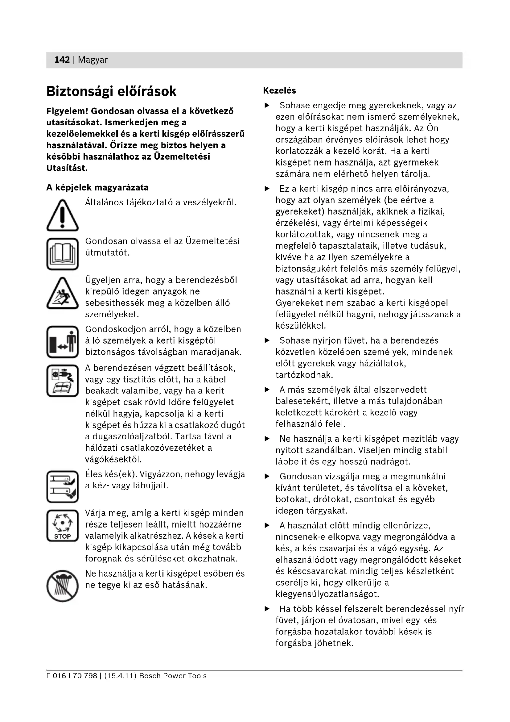 Biztonsági előírások Figyelem! Gondosan olvassa el a következő utasításokat. Ismerkedjen meg a kezelőelemekkel és a kerti kisgép előírásszerű használatával. Őrizze meg biztos helyen a későbbi használathoz az Üzemeltetési Utasítást. A képjelek magyarázata Általános tájékoztató a veszélyekről. Gondosan olvassa el az Üzemeltetési útmutatót. Ügyeljen arra, hogy a berendezésből kirepülő idegen anyagok ne sebesithessék meg a közelben álló személyeket. Gondoskodjon arról, hogy a közelben álló személyek a kerti kisgéptől biztonságos távolságban maradjanak. A berendezésen végzett beállítások, vagy egy tisztítás előtt, ha a kábel beakadt valamibe, vagy ha a kerit kisgépet csak rövid időre felügyelet nélkül hagyja, kapcsolja ki a kerti kisgépet és húzza ki a csatlakozó dugót a dugaszolóaljzatból. Tartsa távol a hálózati csatlakozóvezetéket a vágókésektől. Éles kés(ek). Vigyázzon, nehogy levágja a kéz- vagy lábujjait. Várja meg, amíg a kerti kisgép minden része teljesen leállt, mieltt hozzáérne valamelyik alkatrészhez. A kések a kerti kisgép kikapcsolása után még tovább forognak és sérüléseket okozhatnak. Ne használja a kerti kisgépet esőben és ne tegye ki az eső hatásának. Kezelés f Sohase engedje meg gyerekeknek, vagy az ezen előírásokat nem ismerő személyeknek, hogy a kerti kisgépet használják. Az Ön országában érvényes előírások lehet hogy korlatozzák a kezelő korát. Ha a kerti kisgépet nem használja, azt gyermekek számára nem elérhető helyen tárolja. f Ez a kerti kisgép nincs arra előirányozva, hogy azt olyan személyek (beleértve a gyerekeket) használják, akiknek a fizikai, érzékelési, vagy értelmi képességeik korlátozottak, vagy nincsenek meg a megfelelő tapasztalataik, illetve tudásuk, kivéve ha az ilyen személyekre a biztonságukért felelős más személy felügyel, vagy utasításokat ad arra, hogyan kell használni a kerti kisgépet. Gyerekeket nem szabad a kerti kisgéppel felügyelet nélkül hagyni, nehogy játsszanak a készülékkel. f Sohase nyírjon füvet, ha a berendezés közvetlen közelében személyek, mindenek előtt gyerekek vagy háziállatok, tartózkodnak. f A más személyek által elszenvedett balesetekért, illetve a más tulajdonában keletkezett károkért a kezelő vagy felhasználó felel. f Ne használja a kerti kisgépet mezítláb vagy nyitott szandálban. Viseljen mindig stabil lábbelit és egy hosszú nadrágot. f Gondosan vizsgálja meg a megmunkálni kívánt területet, és távolítsa el a köveket, botokat, drótokat, csontokat és egyéb idegen tárgyakat. f A használat előtt mindig ellenőrizze, nincsenek-e elkopva vagy megrongálódva a kés, a kés csavarjai és a vágó egység. Az elhasználódott vagy megrongálódott késeket és késcsavarokat mindig teljes készletként cserélje ki, hogy elkerülje a kiegyensúlyozatlanságot. f Ha több késsel felszerelt berendezéssel nyír füvet, járjon el óvatosan, mivel egy kés forgásba hozatalakor további kések is forgásba jöhetnek. STOP OBJ_BUCH-1393-001.book Page 142 Friday, April 15, 2011 10:36 AMMagyar | 143 Bosch Power Tools F 016 L70 798 | (15.4.11) f Csak nappali fénynél vagy jó mesterséges megvilágitás mellett nyírjon füvet. f A kerti kisgépet nedves fűben lehetőség szerint ne használja. f Mindig nyugodtan menjen, sohase fusson gyorsan. f A lejtőkön végzett munka veszélyes lehet. – Különösen meredek lejtőkön ne nyírjon füvet. – Ferde felületeken, vagy nedves fűben mindig ügyeljen arra, hogy csak biztonságos, szilárd helyekre lépjen. – Ferde felületeken mindig keresztben haladva, sohase fel- vagy lefelé haladva nyírjon füvet. – A lejtőkön irányváltoztatás esetén különösen óvatosan kell eljárni. – Hátrafelé menés vagy a kerti kisgép húzása esetén igen óvatosan kell eljárni. – A kerti kisgépet a a fűnyírás közben mindig előrefelé tolja és sohase a teste felé húzza. f A késeknek nyugalmi helyzetben kell lenniük, ha a kerti kisgépet a szállításhoz meg kell billenteni, ha a kerti kisgéppel fűmentes területen halad keresztül, valamint amikor a kerti kisgépet a nyírásra kerülő területhez illetve attól elszállítja. f A kerti kisgépet az elindításnál vagy a motor bekapcsolásánál ne billentse meg, kivéve ha ehhez a magas fűben való munkához okvetlenül szükség van. Ebben az esetben a kerti kisgépnek a kezelőtől távolabbi oldalát a fogantyú lenyomásával ne emelje fel jobban, mint amennyire okvetlenül szükséges. Ügyeljen arra, hogy mindkét keze a fogantyún legyen, amikor a kerti kisgépet ismét leereszti. f Az Üzemeltetési útmutatónak megfelelően kapcsolja be a kerti kisgépet, és ügyeljen arra, hogy a lábai elég messze legyenek a forgó alkatrészektől. f A kezeit és a lábait sohase tegye a forgó alkatrészek közelébe vagy azok alá. f Tartson be megfelelő távolságot a kivető zóna felé, ha a kerti kisgéppel dolgozik. f Sohase emelje fel és sohase vigye a kerti kisgépet működő motor mellett. f A kerti kisgépet sohase üzemeltesse meghibásodott védőberendezésekkel, vagy fedéllel, illetve biztonsági berendezések, mint például ütközésvédő és/vagy fűgyűjtő kosár nélkül. f A fűnyírógépen végzett beállítási munkák során igen óvatosan kell eljárni, nehogy a keze vagy a lába beszoruljon a mozgatható kések és a fűnyírógép rögzített alkatrészei közé. f Tartsa távol a késektől a hálózati csatlakozó és hosszabbító kábelt. A kések megsérthetik a kábelt és a kezelő feszültség alatt álló alkatrészekkel juthat érintkezésbe. Vigyázat, ez áramütéshez vezethet. Húzza ki a csatlakozó dugót a dugaszoló aljzatból: – minden olyan esetben, ha őrizet nélkül hagyja a kerti kisgépet, – a beékelődések elhárítása előtt, – 