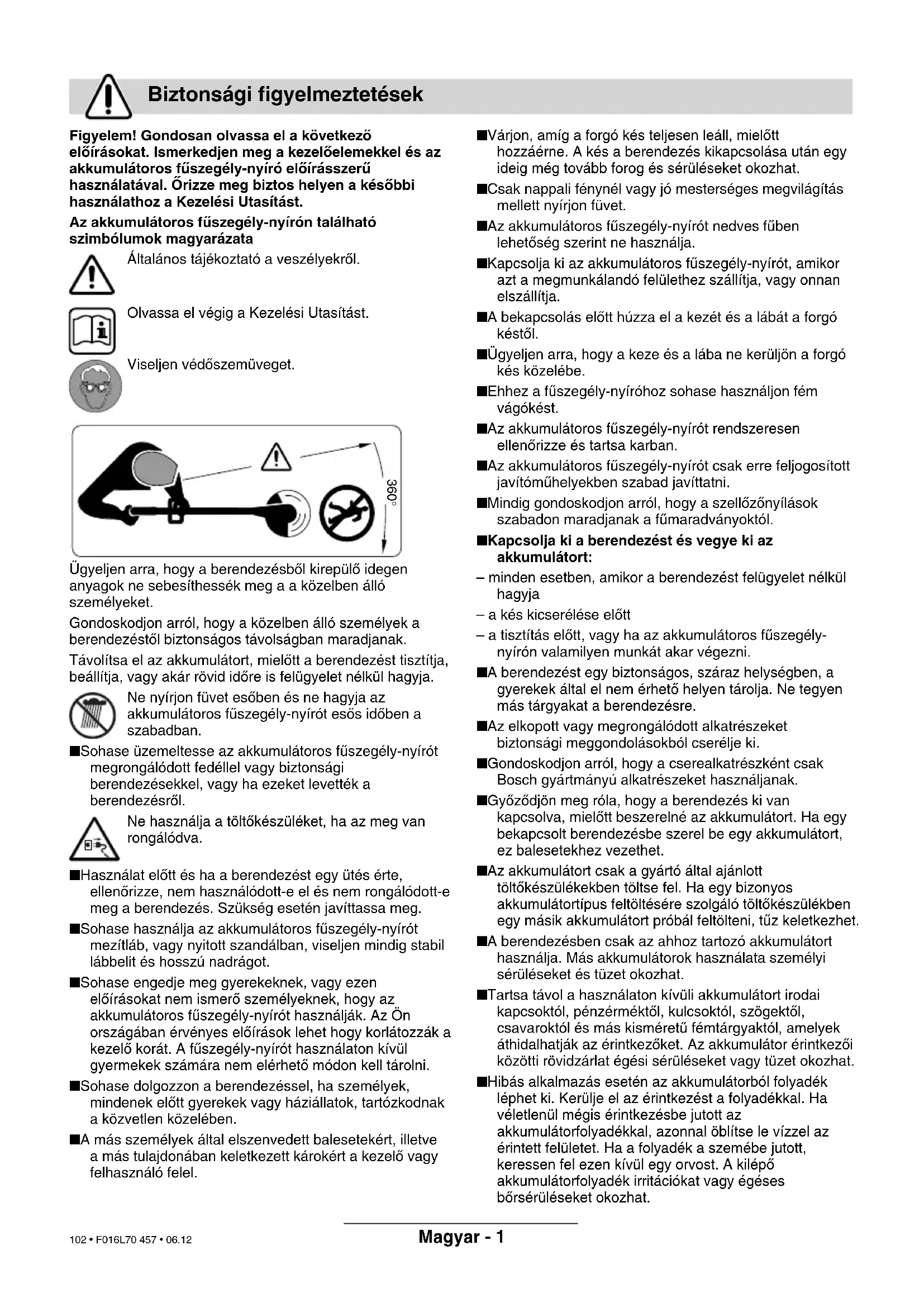 V˘robca si vyhradzuje právo zmien Likvidácia SluÏba zákazníkom Vyhlásenie o konformite F016L70 457.book Seite 6 Montag, 18. Dezember 2006 9:45 09 101 • F016L70 457 • 06.12Magyar - 1 Figyelem! Gondosan olvassa el a következœ elœírásokat. Ismerkedjen meg a kezelœelemekkel és az akkumulátoros fæszegély-nyíró elœírásszeræ használatával. Œrizze meg biztos helyen a késœbbi használathoz a Kezelési Utasítást. Az akkumulátoros fæszegély-nyírón található szimbólumok magyarázata Általános tájékoztató a veszélyekrœl. Olvassa el végig a Kezelési Utasítást. Viseljen védœszemüveget. Ügyeljen arra, hogy a berendezésbœl kirepülœ idegen anyagok ne sebesíthessék meg a a közelben álló személyeket. Gondoskodjon arról, hogy a közelben álló személyek a berendezéstœl biztonságos távolságban maradjanak. Távolítsa el az akkumulátort, mielœtt a berendezést tisztítja, beállítja, vagy akár rövid idœre is felügyelet nélkül hagyja. Ne nyírjon füvet esœben és ne hagyja az akkumulátoros fæszegély-nyírót esœs idœben a szabadban. ■ Sohase üzemeltesse az akkumulátoros fæszegély-nyírót megrongálódott fedéllel vagy biztonsági berendezésekkel, vagy ha ezeket levették a berendezésrœl. Ne használja a töltœkészüléket, ha az meg van rongálódva. ■ Használat elœtt és ha a berendezést egy ütés érte, ellenœrizze, nem használódott-e el és nem rongálódott-e meg a berendezés. Szükség esetén javíttassa meg. ■ Sohase használja az akkumulátoros fæszegély-nyírót mezítláb, vagy nyitott szandálban, viseljen mindig stabil lábbelit és hosszú nadrágot. ■ Sohase engedje meg gyerekeknek, vagy ezen elœírásokat nem ismerœ személyeknek, hogy az akkumulátoros fæszegély-nyírót használják. Az Ön országában érvényes elœírások lehet hogy korlátozzák a kezelœ korát. A fæszegély-nyírót használaton kívül gyermekek számára nem elérhetœ módon kell tárolni. ■ Sohase dolgozzon a berendezéssel, ha személyek, mindenek elœtt gyerekek vagy háziállatok, tartózkodnak a közvetlen közelében. ■ A más személyek által elszenvedett balesetekért, illetve a más tulajdonában keletkezett károkért a kezelœ vagy felhasználó felel. ■ Várjon, amíg a forgó kés teljesen leáll, mielœtt hozzáérne. A kés a berendezés kikapcsolása után egy ideig még tovább forog és sérüléseket okozhat. ■ Csak nappali fénynél vagy jó mesterséges megvilágítás mellett nyírjon füvet. ■ Az akkumulátoros fæszegély-nyírót nedves fæben lehetœség szerint ne használja. ■ Kapcsolja ki az akkumulátoros fæszegély-nyírót, amikor azt a megmunkálandó felülethez szállítja, vagy onnan elszállítja. ■ A bekapcsolás elœtt húzza el a kezét és a lábát a forgó késtœl. ■ Ügyeljen arra, hogy a keze és a lába ne kerüljön a forgó kés közelébe. ■ Ehhez a fæszegély-nyíróhoz sohase használjon fém vágókést. ■ Az akkumulátoros fæszegély-nyírót rendszeresen ellenœrizze és tartsa karban. ■ Az akkumulátoros fæszegély-nyírót csak erre feljogosított javítómæhelyekben szabad javíttatni. ■ Mindig gondoskodjon arról, hogy a szellœzœnyílások szabadon maradjanak a fæmaradványoktól. ■ Kapcsolja ki a berendezést és vegye ki az akkumulátort: – minden esetben, amikor a berendezést felügyelet nélkül hagyja – a kés kicserélése elœtt – a tisztítás elœtt, vagy ha az akkumulátoros fæszegély- nyírón valamilyen munkát akar végezni. ■ A berendezést egy biztonságos, száraz helységben, a gyerekek által el nem érhetœ helyen tárolja. Ne tegyen más tárgyakat a berendezésre. ■ Az elkopott vagy megrongálódott alkatrészeket biztonsági meggondolásokból cserélje ki. ■ Gondoskodjon arról, hogy a cserealkatrészként csak Bosch gyártmányú alkatrészeket használjanak. ■ Gyœzœdjön meg róla, hogy a berendezés ki van kapcsolva, mielœtt beszerelné az akkumulátort. Ha egy bekapcsolt berendezésbe szerel be egy akkumulátort, ez balesetekhez vezethet. ■ Az akkumulátort csak a gyártó által ajánlott töltœkészülékekben töltse fel. Ha egy bizonyos akkumulátortípus feltöltésére szolgáló töltœkészülékben egy másik akkumulátort próbál feltölteni, tæz keletkezhet. ■ A berendezésben csak az ahhoz tartozó akkumulátort használja. Más akkumulátorok használata személyi sérüléseket és tüzet okozhat. ■ Tartsa távol a használaton kívüli akkumulátort irodai kapcsoktól, pénzérméktœl, kulcsoktól, szögektœl, csavaroktól és más kisméretæ fémtárgyaktól, amelyek áthidalhatják az érintkezœket. Az akkumulátor érintkezœi közötti rövidzárlat égési sérüléseket vagy tüzet okozhat. ■ Hibás alkalmazás esetén az akkumulátorból folyadék léphet ki. Kerülje el az érintkezést a folyadékkal. Ha véletlenül mégis érintkezésbe jutott az akkumulátorfolyadékkal, azonnal öblítse le vízzel az érintett felületet. Ha a folyadék a szemébe jutott, keressen fel ezen kívül egy orvost. A kilépœ akkumulátorfolyadék irritációkat vagy égéses bœrsérüléseket okozhat. Biztonsági figyelmeztetések 360° F016L70 457.book Seite 1 Montag, 18. Dezember 2006 9:45 09 102 • F016L70 457 • 06.12Magyar - 2 A készülék a bokrok alatt, lejtœkön és széleken történœ fæ- és gyomnyírásra szolgál, ahol ezekhez egy fænyírógéppel nem lehet hozzáférni. A rendeltetésszeræ használat egy 0 °C és 40 °C közötti környezeti hœmérsékletre vonatkozik. Ez a kézikönyv az Ön berendezésének helyes összeszerelésére és biztonságos használatára vonatkozó elœírásokat tartalmazza. Igen fontos, hogy gondosan elolvassa ezeket az elœírásokat. Óvatosan vegye ki az akkumulátoros fæszegély- nyírót a csomagolásból és ellenœrizze, hogy az alábbi alkatrészek teljes mértékben meg