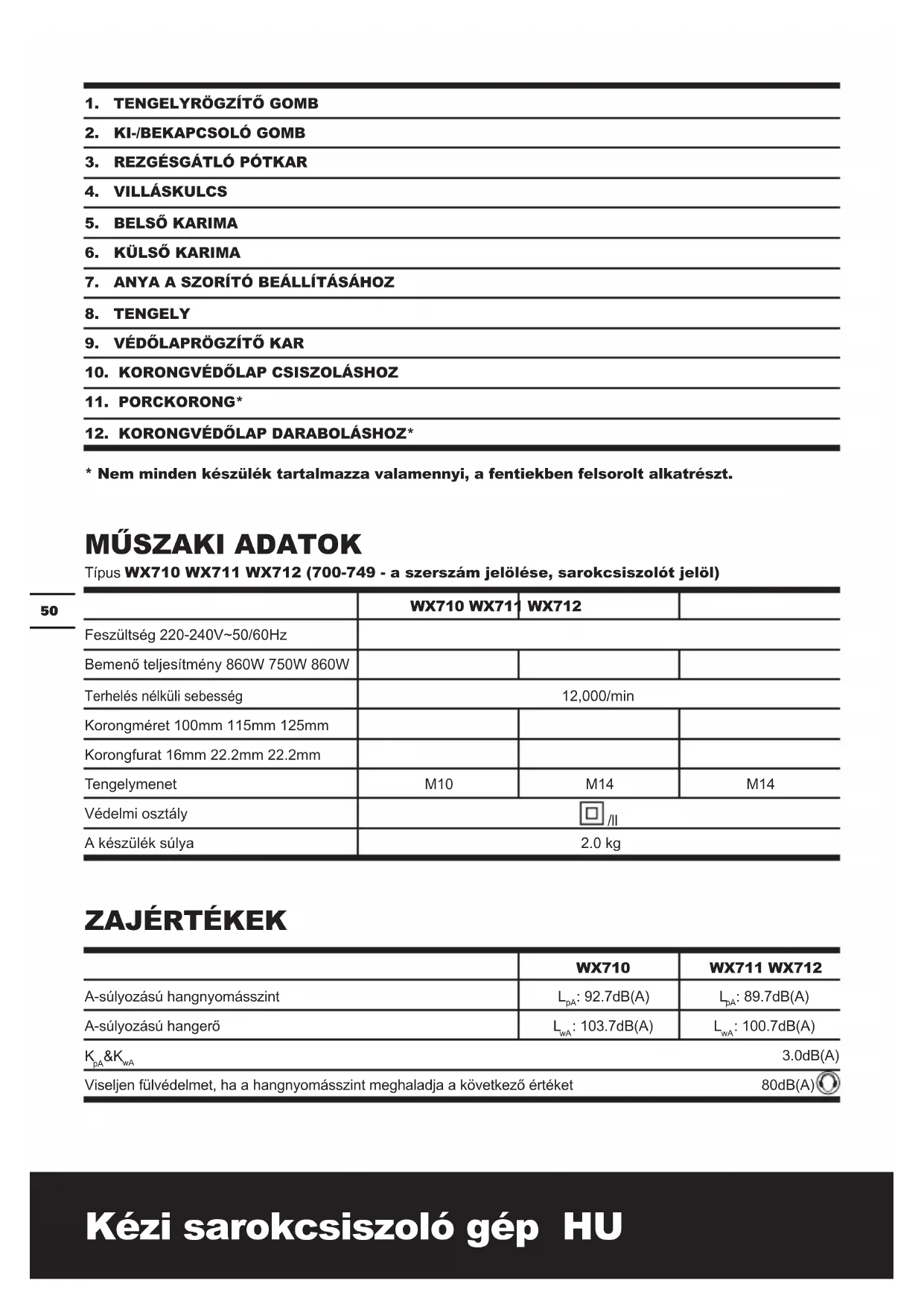 Típus WX710 WX711 WX712 (700-749 - a szerszám jelölése, sarokcsiszolót jelöl) WX710 WX711 WX712 Feszültség 220-240V~50/60Hz Bemenő teljesítmény 860W 750W 860W Terhelés nélküli sebesség 12,000/min Korongméret 100mm 115mm 125mm Korongfurat 16mm 22.2mm 22.2mm Tengelymenet M10 M14 M14 Védelmi osztály /ll A készülék súlya 2.0 kg