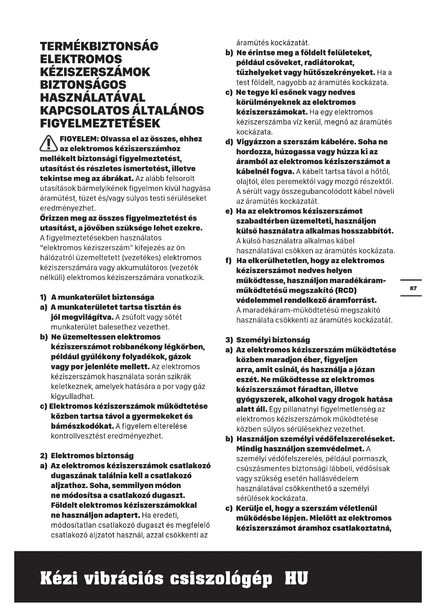 FIGYELMEZTETÉSEK FIGYELEM: Olvassa el az összes, ehhez az elektromos kéziszerszámhoz mellékelt biztonsági figyelmeztetést, utasítást és részletes ismertetést, illetve tekintse meg az ábrákat. Az alább felsorolt utasítások bármelyikének figyelmen kívül hagyása áramütést, tüzet és/vagy súlyos testi sérüléseket eredményezhet. Őrizzen meg az összes figyelmeztetést és utasítást, a jövőben szüksége lehet ezekre. A figyelmeztetésekben használatos “elektromos kéziszerszám” kifejezés az ön hálózatról üzemeltetett (vezetékes) elektromos kéziszerszámára vagy akkumulátoros (vezeték nélküli) elektromos kéziszerszámára vonatkozik.