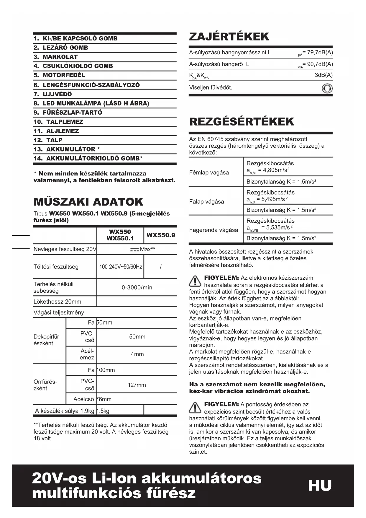 Típus WX550 WX550.1 WX550.9 (5-megjelölés fűrész jelöl) WX550 WX550.1 WX550.9 Nevleges feszultseg 20V Max** Töltési feszültség 100-240V~50/60Hz