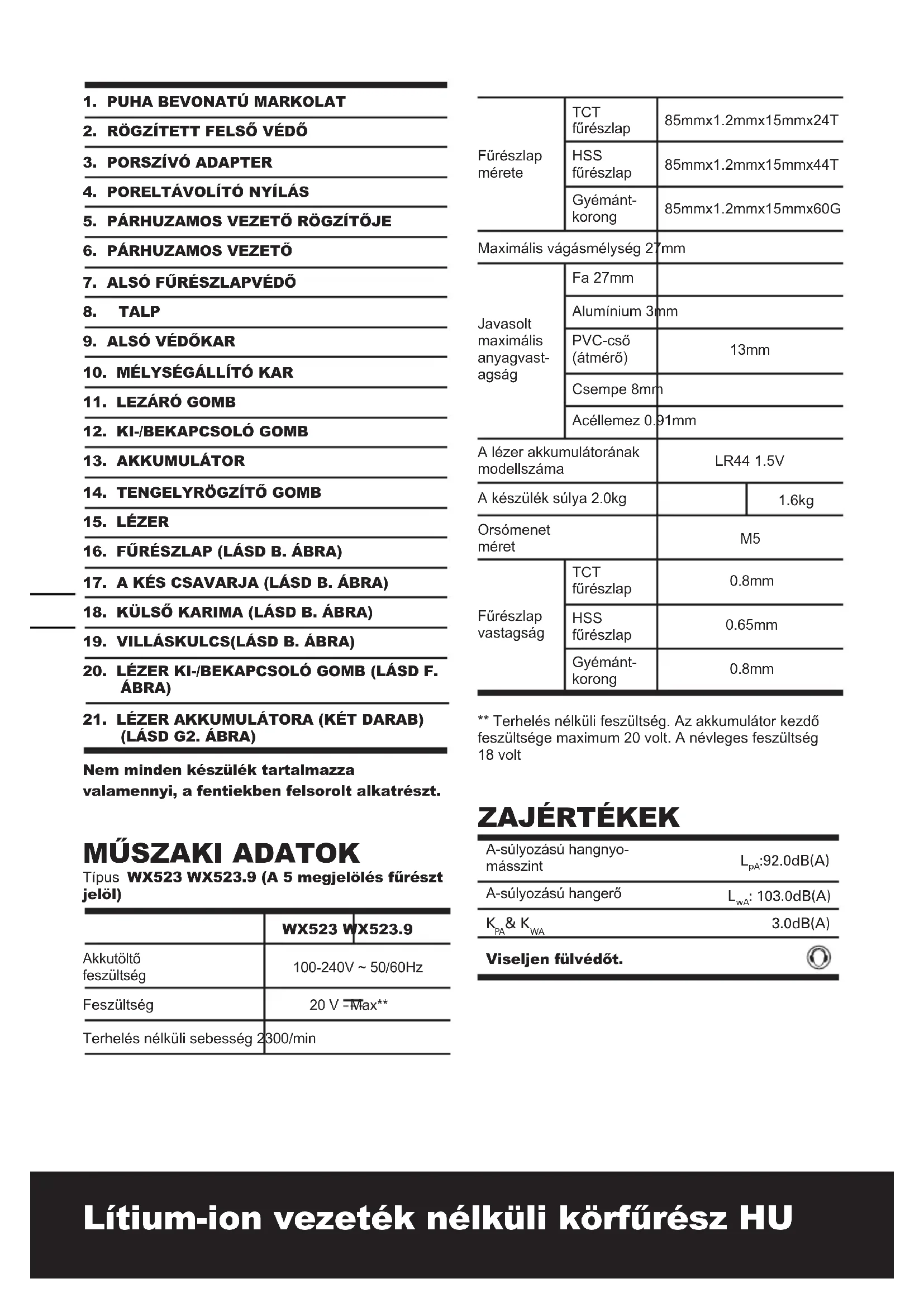 Típus WX523 WX523.9 (A 5 megjelölés fűrészt jelöl) WX523 WX523.9 Akkutöltő feszültség 100-240V ~ 50/60Hz Feszültség 20 V Max** Terhelés nélküli sebesség 2300/min Fűrészlap mérete TCT fűrészlap 85mmx1.2mmx15mmx24T HSS fűrészlap 85mmx1.2mmx15mmx44T Gyémánt- korong 85mmx1.2mmx15mmx60G Maximális vágásmélység 27mm Javasolt maximális anyagvast- agság Fa 27mm Alumínium 3mm PVC-cső (átmérő) 13mm Csempe 8mm Acéllemez 0.91mm A lézer akkumulátorának modellszáma LR44 1.5V A készülék súlya 2.0kg 1.6kg Orsómenet méret