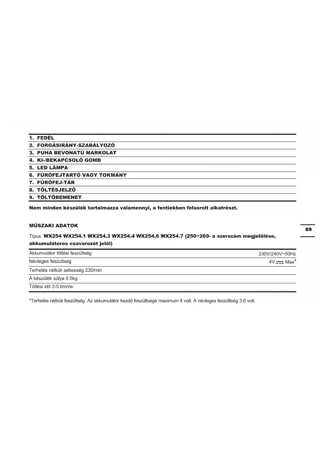 Típus WX254 WX254.1 WX254.3 WX254.4 WX254.6 WX254.7 (250~269- a szerszám megjelölése, akkumulátoros csavarozót jelöl) Akkumulátor töltési feszültség 230V/240V~50Hz Nevleges feszultseg