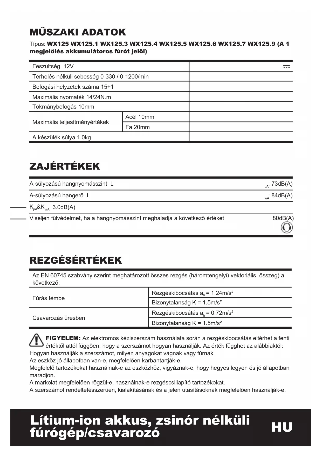 wX125 wX125.1 wX125.3 wX125.4 Akkumulátor (1.3Ah) 1 2 1 2 Töltés 3 óra 3 óra 30 perc 30 perc Kétvégű bit 1 1 1 1 40 darabos tartozékkészlet / / / / wX125.5 wX125.6 wX125.7 wX125.9 Akkumulátor (1.3Ah) 1 2 1 / Töltés 3 óra 1óra 1óra / Kétvégű bit / 1 1 1 40 darabos tartozékkészlet 1 / / / Javasoljuk, hogy a tartozékokat ugyanabból a boltból vásárolja meg, ahol a szerszámot is vásárolta. Jó minőségű, márkás tartozékokat használjon. A tartozék típusát az elvégzendő munkának megfelelően válassza meg. További részleteket a tartozék csomagolásán talál. Kérjen segítséget és tanácsot a bolti eladóktól.6564