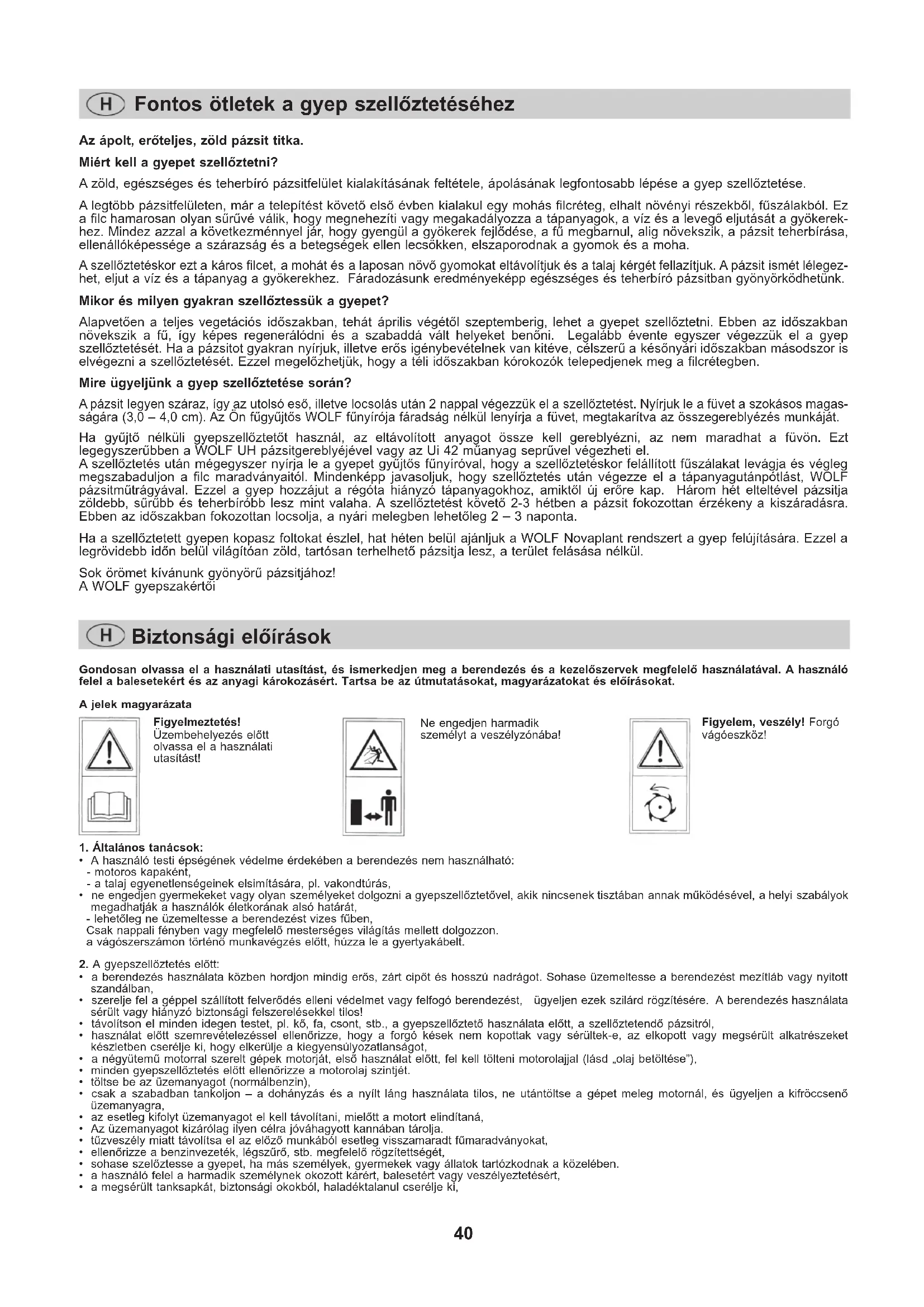 V jiných případech kontaktujte servisní středisko WOLF. Vertikuátor před každou kontrolou nebo pracemi na válci vypněte a vytáhněte konektor na svíčce.40 Gondosan olvassa el a használati utasítást, és ismerkedjen meg a berendezés és a kezelőszervek megfelelő használatával. A használó felel a balesetekért és az anyagi károkozásért. Tartsa be az útmutatásokat, magyarázatokat és előírásokat. A jelek magyarázata Az ápolt, erőteljes, zöld pázsit titka. Miért kell a gyepet szellőztetni? A zöld, egészséges és teherbíró pázsitfelület kialakításának feltétele, ápolásának legfontosabb lépése a gyep szellőztetése. A legtöbb pázsitfelületen, már a telepítést követő első évben kialakul egy mohás filcréteg, elhalt növényi részekből, fűszálakból. Ez a filc hamarosan olyan sűrűvé válik, hogy megnehezíti vagy megakadályozza a tápanyagok, a víz és a levegő eljutását a gyökerek- hez. Mindez azzal a következménnyel jár, hogy gyengül a gyökerek fejlődése, a fű megbarnul, alig növekszik, a pázsit teherbírása, ellenállóképessége a szárazság és a betegségek ellen lecsökken, elszaporodnak a gyomok és a moha. A szellőztetéskor ezt a káros filcet, a mohát és a laposan növő gyomokat eltávolítjuk és a talaj kérgét fellazítjuk. A pázsit ismét lélegez- het, eljut a víz és a tápanyag a gyökerekhez. Fáradozásunk eredményeképp egészséges és teherbíró pázsitban gyönyörködhetünk. Mikor és milyen gyakran szellőztessük a gyepet? Alapvetően a teljes vegetációs időszakban, tehát április végétől szeptemberig, lehet a gyepet szellőztetni. Ebben az időszakban növekszik a fű, így képes regenerálódni és a szabaddá vált helyeket benőni. Legalább évente egyszer végezzük el a gyep szellőztetését. Ha a pázsitot gyakran nyírjuk, illetve erős igénybevételnek van kitéve, célszerű a későnyári időszakban másodszor is elvégezni a szellőztetését. Ezzel megelőzhetjük, hogy a téli időszakban kórokozók telepedjenek meg a filcrétegben. Mire ügyeljünk a gyep szellőztetése során? A pázsit legyen száraz, így az utolsó eső, illetve locsolás után 2 nappal végezzük el a szellőztetést. Nyírjuk le a füvet a szokásos magas- ságára (3,0 – 4,0 cm). Az Ön fűgyűjtős WOLF fűnyírója fáradság nélkül lenyírja a füvet, megtakarítva az összegereblyézés munkáját. Ha gyűjtő nélküli gyepszellőztetőt használ, az eltávolított anyagot össze kell gereblyézni, az nem maradhat a füvön. Ezt legegyszerűbben a WOLF UH pázsitgereblyéjével vagy az Ui 42 műanyag seprűvel végezheti el. A szellőztetés után mégegyszer nyírja le a gyepet gyűjtős fűnyíróval, hogy a szellőztetéskor felállított fűszálakat levágja és végleg megszabaduljon a filc maradványaitól. Mindenképp javasoljuk, hogy szellőztetés után végezze el a tápanyagutánpótlást, WOLF pázsitműtrágyával. Ezzel a gyep hozzájut a régóta hiányzó tápanyagokhoz, amiktől új erőre kap. Három hét elteltével pázsitja zöldebb, sűrűbb és teherbíróbb lesz mint valaha. A szellőztetést követő 2-3 hétben a pázsit fokozottan érzékeny a kiszáradásra. Ebben az időszakban fokozottan locsolja, a nyári melegben lehetőleg 2 – 3 naponta. Ha a szellőztetett gyepen kopasz foltokat észlel, hat héten belül ajánljuk a WOLF Novaplant rendszert a gyep felújítására. Ezzel a legrövidebb időn belül világítóan zöld, tartósan terhelhető pázsitja lesz, a terület felásása nélkül. Sok örömet kívánunk gyönyörű pázsitjához! A WOLF gyepszakértői Figyelmeztetés! Üzembehelyezés előtt olvassa el a használati utasítást! Ne engedjen harmadik személyt a veszélyzónába! Figyelem, veszély! Forgó vágóeszköz!