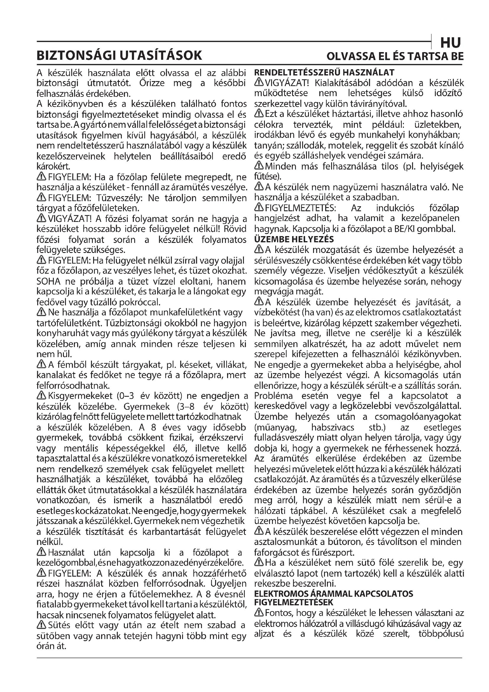 VIGYÁZAT! Kialakításából adódóan a készülék működtetése nem lehetséges külső időzítő szerkezettel vagy külön távirányítóval. Ezt a készüléket háztartási, illetve ahhoz hasonló célokra tervezték, mint például: üzletekben, irodákban lévő és egyéb munkahelyi konyhákban; tanyán; szállodák, motelek, reggelit és szobát kínáló és egyéb szálláshelyek vendégei számára. Minden más felhasználása tilos (pl. helyiségek fűtése). A készülék nem nagyüzemi használatra való. Ne használja a készüléket a szabadban. FIGYELMEZTETÉS: Az indukciós főzőlap hangjelzést adhat, ha valamit a kezelőpanelen hagynak. Kapcsolja ki a főzőlapot a BE/KI gombbal.