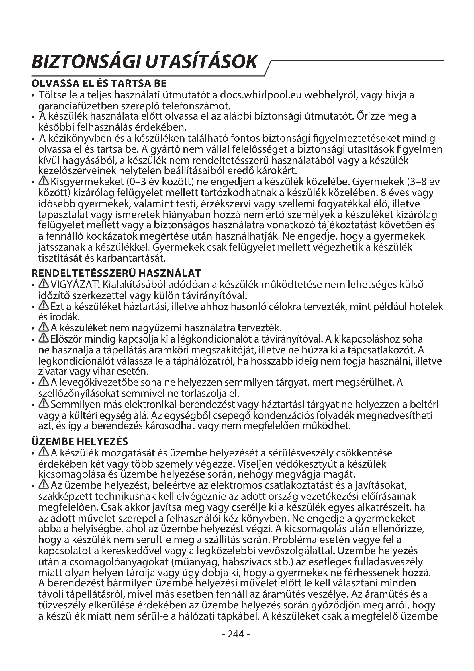 - Az egység fűtési módról jégtelenítésre vált. A jelzőfény ki fog aludni, és a berendezés visszatér fűtési módba. Megjegyzés: Ha a probléma továbbra is fennáll, kapcsolja ki a berendezést és válassza le a tápellátásról, majd lépjen kapcsolatba a legközelebbi hivatalos Whirlpool szervizközponttal. A berendezést ne próbálja meg maga áthelyezni, megjavítani, szétszerelni vagy módosítani.- 259 -