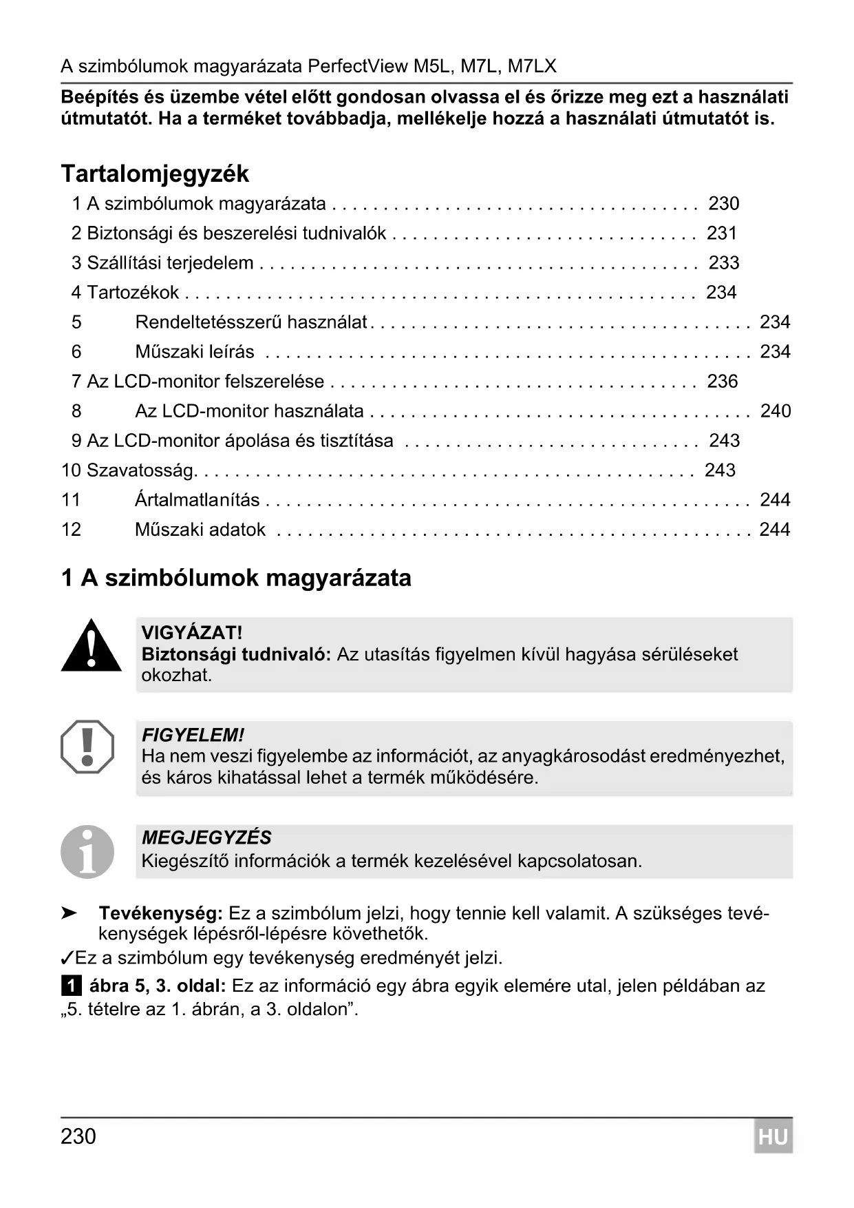 ➤ Tevékenység: Ez a szimbólum jelzi, hogy tennie kell valamit. A szükséges tevé- kenységek lépésről-lépésre követhetők. ✓ Ez a szimbólum egy tevékenység eredményét jelzi. 1 ábra 5, 3. oldal: Ez az információ egy ábra egyik elemére utal, jelen példában az „5. tételre az 1. ábrán, a 3. oldalon”. VIGYÁZAT! Biztonsági tudnivaló: Az utasítás figyelmen kívül hagyása sérüléseket okozhat. FIGYELEM! Ha nem veszi figyelembe az információt, az anyagkárosodást eredményezhet, és káros kihatással lehet a termék működésére. MEGJEGYZÉS Kiegészítő információk a termék kezelésével kapcsolatosan.PerfectView M5L, M7L, M7LX Biztonsági és beszerelési tudnivalók