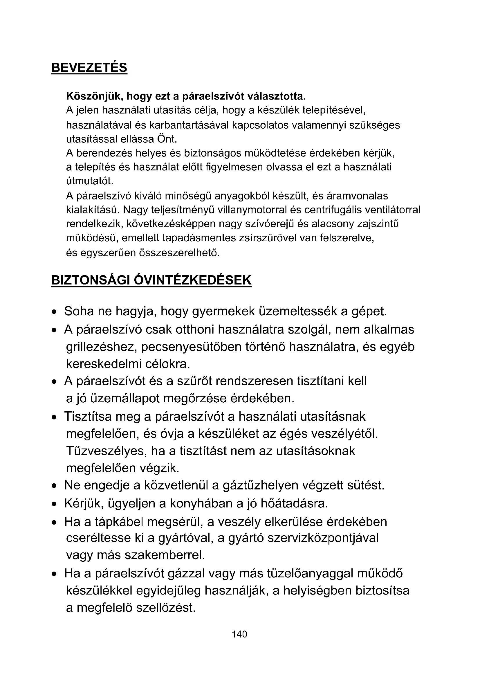 - A páraelszívó csak otthoni használatra szolgál, nem alkalmas grillezéshez, pecsenyesütőben történő használatra, és egyéb kereskedelmi célokra.