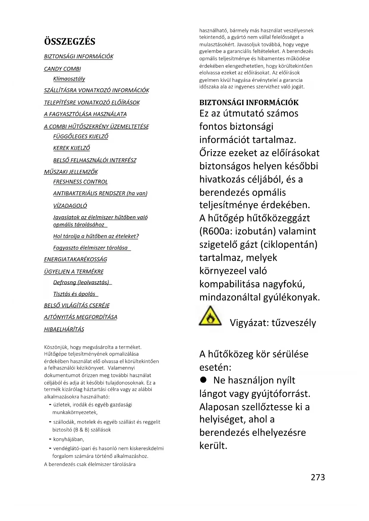 ОЕЕО трябва да се предават на съответните пунктове за събиране, управлявани от общината или от регистрирани дружества. За големи ОЕЕО в много държави може да има възможност за взимане от дома. В много държави, когато закупите нов уред, старият може да бъде върнат на търговеца, който трябва да го вземе безплатно на основа едно за едно, стига обзавеждането да е от еквивалентен тип и да има същите функции като предоставеното такова. Съответствие С поставянето на маркировка върху този продукт потвърждаваме съответствието на всички европейски изисквания за безопасност, здраве и опазване на околната среда, приложими от законодателството за този продукт.273 Magyar ÖSSZEGZÉS BIZTONSÁGI INFORMÁCIÓK CANDY COMBI Klímaosztály SZÁLLÍTÁSRA VONATKOZÓ INFORMÁCIÓK TELEPÍTÉSRE VONATKOZÓ ELŐÍRÁSOK A FAGYASZTÓLÁSA HASZNÁLATA A COMBI HŰTŐSZEKRÉNY ÜZEMELTETÉSE FÜGGŐLEGES KIJELZŐ KEREK KIJELZŐ BELSŐ FELHASZNÁLÓI INTERFÉSZ MŰSZAKI JELLEMZŐK FRESHNESS CONTROL ANTIBAKTERIÁLIS RENDSZER (ha van) VÍZADAGOLÓ Javaslatok az élelmiszer hűtőben való optimális tárolásához Hol tárolja a hűtőben az ételeket? Fagyasztott élelmiszer tárolása ENERGIATAKARÉKOSSÁG ÜGYELJEN A TERMÉKRE Defrosting (leolvasztás) Tisztítás és ápolás BELSŐ VILÁGÍTÁS CSERÉJE AJTÓNYITÁS MEGFORDÍTÁSA HIBAELHÁRÍTÁS Köszönjük, hogy megvásárolta a terméket. Hűtőgépe teljesítményének optimalizálása érdekében használat előtt olvassa el körültekintően a felhasználói kézikönyvet. Valamennyi dokumentumot őrizzen meg további használat céljából és adja át későbbi tulajdonosoknak. Ez a termék kizárólag háztartási célra vagy az alábbi alkalmazásokra használható: - üzletek, irodák és egyéb gazdasági munkakörnyezetek, - szállodák, motelek és egyéb szállást és reggelit biztosító (B & B) szállások - konyhájában, - vendéglátó-ipari és hasonló nem kiskereskdelmi forgalom számára történő alkalmazáshoz. A berendezés csak élelmiszer tárolására használható, bármely más használat veszélyesnek tekintendő, a gyártó nem vállal felelősséget a mulasztásokért. Javasoljuk továbbá, hogy vegye figyelembe a garanciális feltételeket. A berendezés optimális teljesítménye és hibamentes működése érdekében elengedhetetlen, hogy körültekintően elolvassa ezeket az előírásokat. Az előírások figyelmen kívül hagyása érvényteleíti a garancia időszaka alatt az ingyenes szervizhez való jogát.