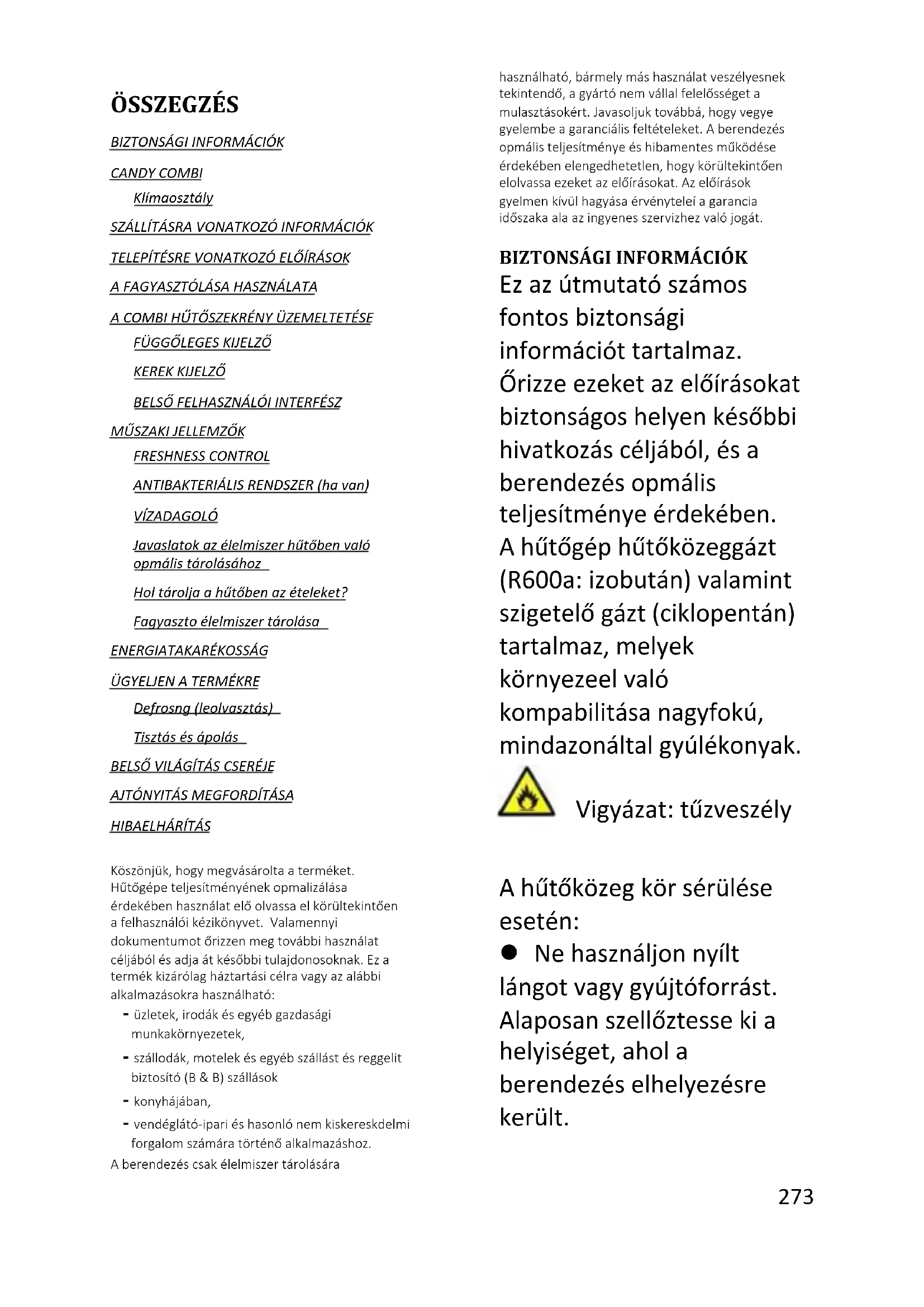 ОЕЕО трябва да се предават на съответните пунктове за събиране, управлявани от общината или от регистрирани дружества. За големи ОЕЕО в много държави може да има възможност за взимане от дома. В много държави, когато закупите нов уред, старият може да бъде върнат на търговеца, който трябва да го вземе безплатно на основа едно за едно, стига обзавеждането да е от еквивалентен тип и да има същите функции като предоставеното такова. Съответствие С поставянето на маркировка върху този продукт потвърждаваме съответствието на всички европейски изисквания за безопасност, здраве и опазване на околната среда, приложими от законодателството за този продукт.273 Magyar ÖSSZEGZÉS BIZTONSÁGI INFORMÁCIÓK CANDY COMBI Klímaosztály SZÁLLÍTÁSRA VONATKOZÓ INFORMÁCIÓK TELEPÍTÉSRE VONATKOZÓ ELŐÍRÁSOK A FAGYASZTÓLÁSA HASZNÁLATA A COMBI HŰTŐSZEKRÉNY ÜZEMELTETÉSE FÜGGŐLEGES KIJELZŐ KEREK KIJELZŐ BELSŐ FELHASZNÁLÓI INTERFÉSZ MŰSZAKI JELLEMZŐK FRESHNESS CONTROL ANTIBAKTERIÁLIS RENDSZER (ha van) VÍZADAGOLÓ Javaslatok az élelmiszer hűtőben való optimális tárolásához Hol tárolja a hűtőben az ételeket? Fagyasztott élelmiszer tárolása ENERGIATAKARÉKOSSÁG ÜGYELJEN A TERMÉKRE Defrosting (leolvasztás) Tisztítás és ápolás BELSŐ VILÁGÍTÁS CSERÉJE AJTÓNYITÁS MEGFORDÍTÁSA HIBAELHÁRÍTÁS Köszönjük, hogy megvásárolta a terméket. Hűtőgépe teljesítményének optimalizálása érdekében használat előtt olvassa el körültekintően a felhasználói kézikönyvet. Valamennyi dokumentumot őrizzen meg további használat céljából és adja át későbbi tulajdonosoknak. Ez a termék kizárólag háztartási célra vagy az alábbi alkalmazásokra használható: - üzletek, irodák és egyéb gazdasági munkakörnyezetek, - szállodák, motelek és egyéb szállást és reggelit biztosító (B & B) szállások - konyhájában, - vendéglátó-ipari és hasonló nem kiskereskdelmi forgalom számára történő alkalmazáshoz. A berendezés csak élelmiszer tárolására használható, bármely más használat veszélyesnek tekintendő, a gyártó nem vállal felelősséget a mulasztásokért. Javasoljuk továbbá, hogy vegye figyelembe a garanciális feltételeket. A berendezés optimális teljesítménye és hibamentes működése érdekében elengedhetetlen, hogy körültekintően elolvassa ezeket az előírásokat. Az előírások figyelmen kívül hagyása érvényteleíti a garancia időszaka alatt az ingyenes szervizhez való jogát.