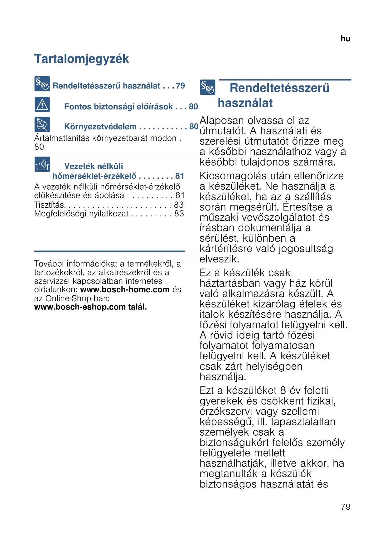 Tartalomjegyzék huHasználati utasítás 8 Rendeltetésszerű használat . . . 79 ( Fontos biztonsági előírások . . . 80 7 Környezetvédelem . . . . . . . . . . . 80 Ártalmatlanítás környezetbarát módon .