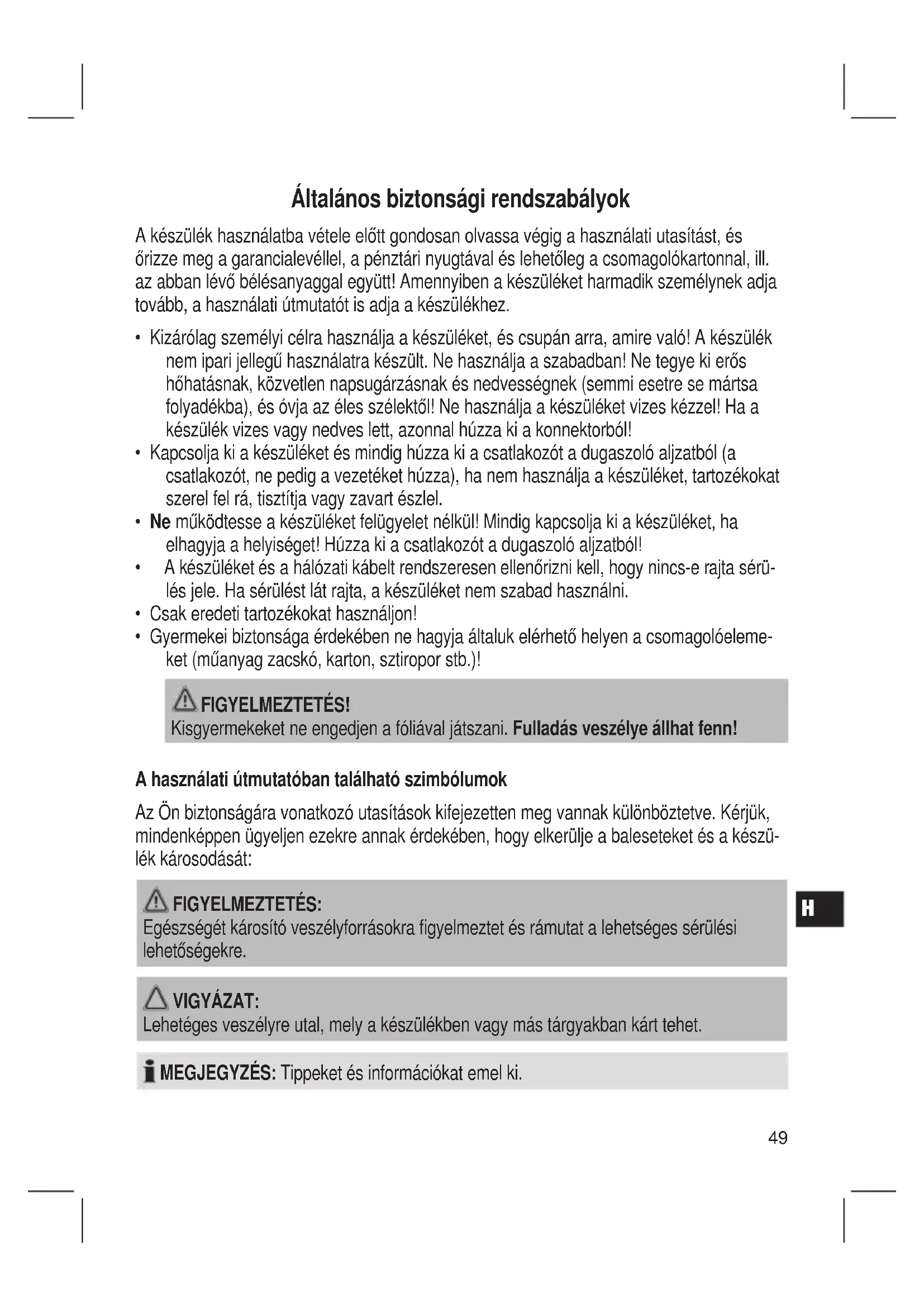 Általános biztonsági rendszabályok A készülék használatba vétele előtt gondosan olvassa végig a használati utasítást, és őrizze meg a garancialevéllel, a pénztári nyugtával és lehetőleg a csomagolókartonnal, ill. az abban lévő bélésanyaggal együtt! Amennyiben a készüléket harmadik személynek adja tovább, a használati útmutatót is adja a készülékhez.