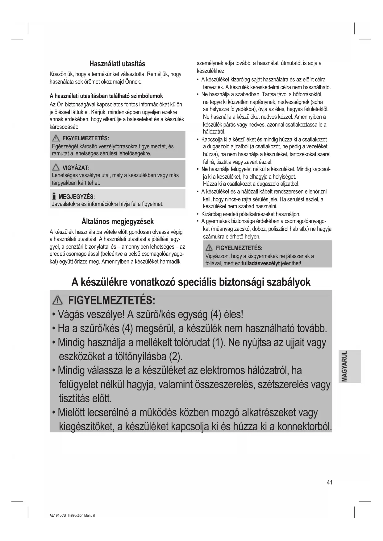 Usuwanie Znaczenie symbolu „Pojemnik na śmieci“ Należy zadbać o środowisko i nie wyrzucać urządzeń elek- trycznych razem z odpadami gospodarstwa domowego. Stare lub uszkodzone urządzenia elektryczne należy odsta- wić do miejskich punktów zbiórki. Prosimy unikać potencjalnych zagrożeń dla zdrowia i środo- wiska poprzez nieprawidłowe metody utylizacji odpadów. Przyczyniasz się do recyklingu i innych form utylizacji zuży- tych urządzeń elektrycznych i elektronicznych. Informacje na temat punktów zbiórki znajdują się na terenie danego miasta.41 AE1918CB_Instruction Manual 26.10.16 Használati utasítás Köszönjük, hogy a termékünket választotta. Reméljük, hogy használata sok örömet okoz majd Önnek. A használati utasításban található szimbólumok Az Ön biztonságával kapcsolatos fontos információkat külön jelöléssel láttuk el. Kérjük, mindenképpen ügyeljen ezekre annak érdekében, hogy elkerülje a baleseteket és a készülék károsodását: FIGYELMEZTETÉS: Egészségét károsító veszélyforrásokra gyelmeztet, és rámutat a lehetséges sérülési lehetőségekre. VIGYÁZAT: Lehetséges veszélyre utal, mely a készülékben vagy más tárgyakban kárt tehet. MEGJEGYZÉS: Javaslatokra és információkra hívja fel a gyelmet. Általános megjegyzések A készülék használatba vétele előtt gondosan olvassa végig a használati utasítást. A használati utasítást a jótállási jegy- gyel, a pénztári bizonylattal és – amennyiben lehetséges – az eredeti csomagolással (beleértve a belső csomagolóanyago- kat) együtt őrizze meg. Amennyiben a készüléket harmadik személynek adja tovább, a használati útmutatót is adja a készülékhez.