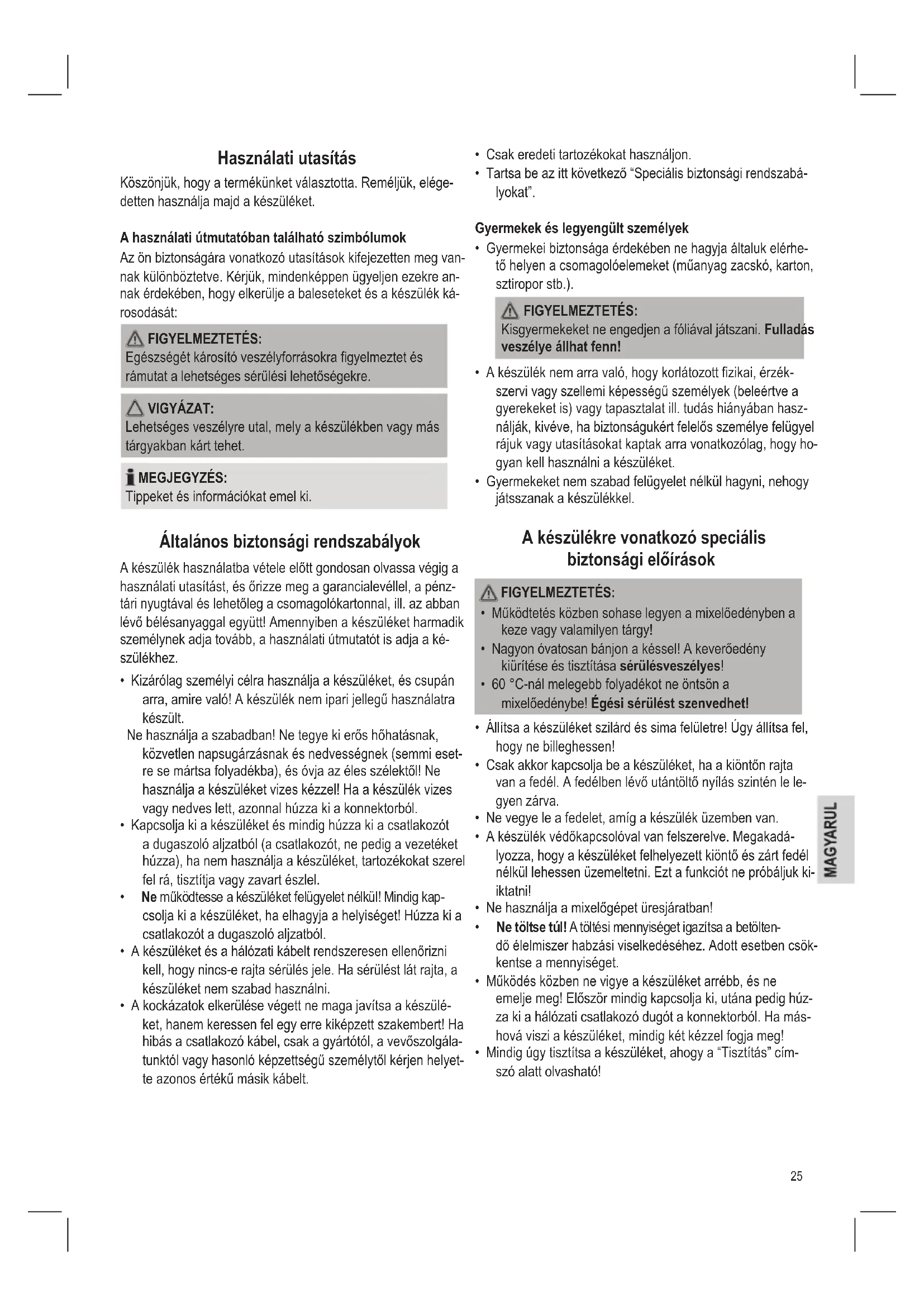 - Tartsa be az itt következő “Speciális biztonsági rendszabá- lyokat”. Gyermekek és legyengült személyek