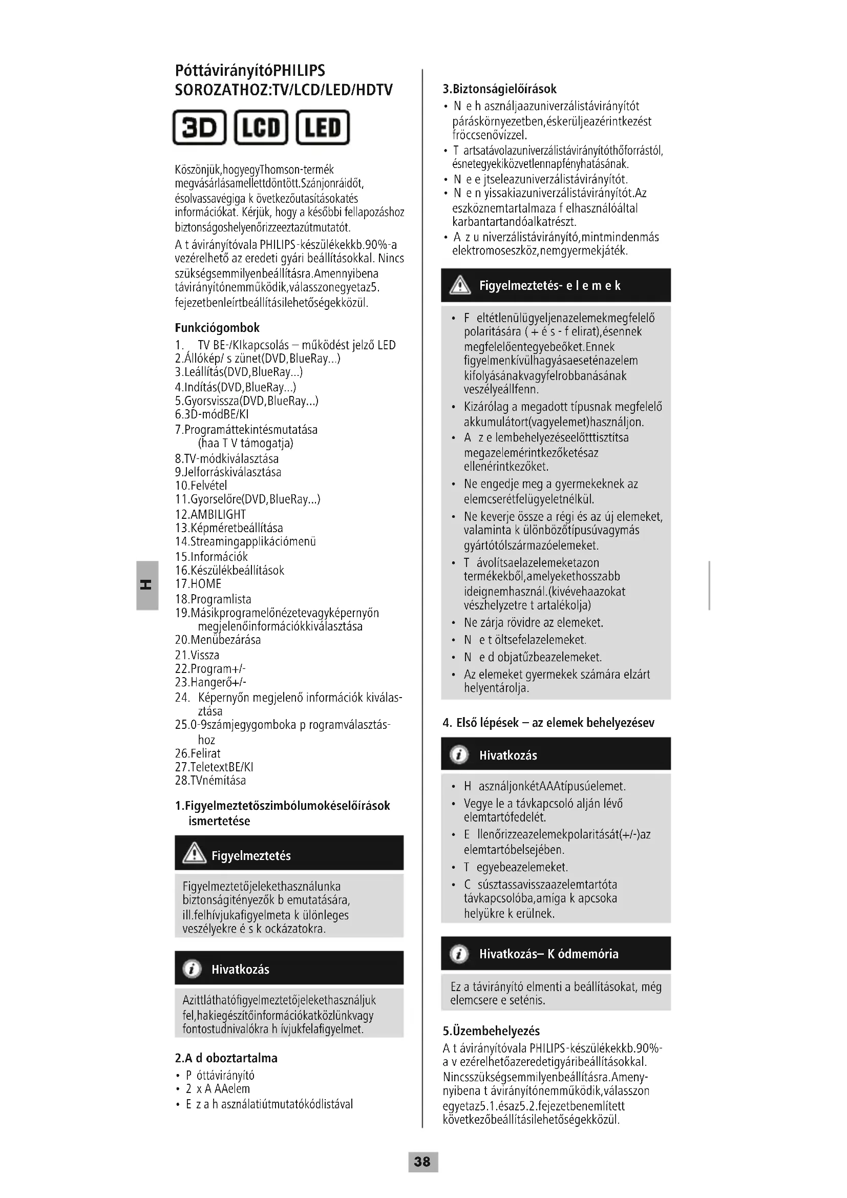 Köszönjük, hogy egy Thomson-termék megvásárlása mellett döntött. Szánjon rá időt, és olvassa végig akövetkező utasításokat és információkat. Kérjük, hogy akésőbbi fellapozáshoz biztonságos helyen őrizze ezt az útmutatót. Atávirányítóval a PHILIPS -készülékek kb. 90%-a vezérelhető az eredetigyári beállításokkal. Nincs szükség semmilyen beállításra. Amennyiben a távirányító nem működik, válasszon egyet az 5. fejezetben leírt beállítási lehetőségek közül. Funkciógombok