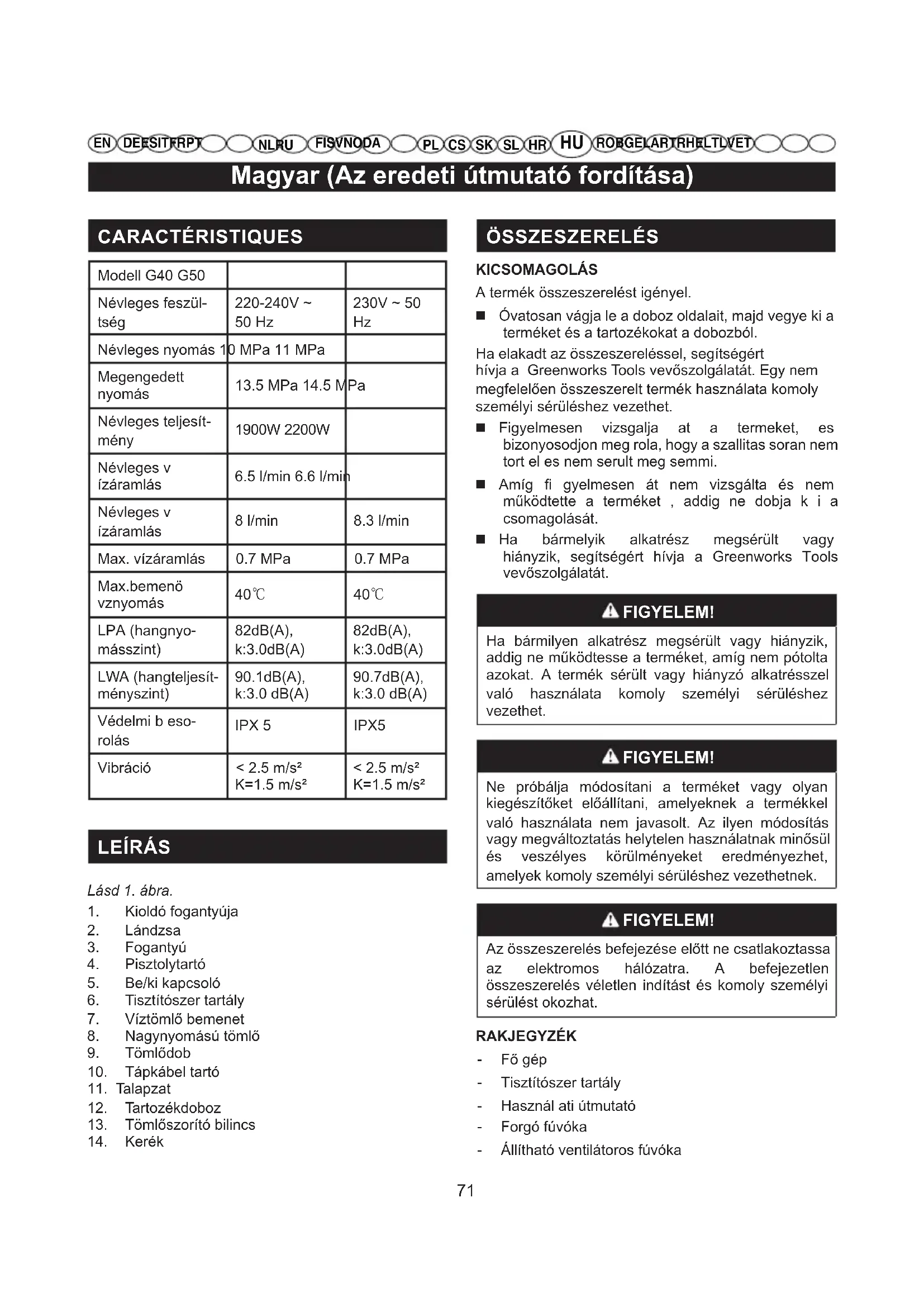 ÖSSZESZERELÉS KICSOMAGOLÁS A termék összeszerelést igényel. Óvatosan vágja le a doboz oldalait, majd vegye ki a terméket és a tartozékokat a dobozból. Ha elakadt az összeszereléssel, segítségért hívja a Greenworks Tools vevőszolgálatát. Egy nem megfelelően összeszerelt termék használata komoly személyi sérüléshez vezethet. Figyelmesen vizsgalja at a termeket, es bizonyosodjon meg rola, hogy a szallitas soran nem tort el es nem serult meg semmi. Amíg fi gyelmesen át nem vizsgálta és nem működtette a terméket , addig ne dobja k i a csomagolását. Ha bármelyik alkatrész megsérült vagy hiányzik, segítségért hívja a Greenworks Tools vevőszolgálatát. FIGYELEM! Ha bármilyen alkatrész megsérült vagy hiányzik, addig ne működtesse a terméket, amíg nem pótolta azokat. A termék sérült vagy hiányzó alkatrésszel való használata komoly személyi sérüléshez vezethet. FIGYELEM! Ne próbálja módosítani a terméket vagy olyan kiegészítőket előállítani, amelyeknek a termékkel való használata nem javasolt. Az ilyen módosítás vagy megváltoztatás helytelen használatnak minősül és veszélyes körülményeket eredményezhet, amelyek komoly személyi sérüléshez vezethetnek. FIGYELEM! Az összeszerelés befejezése előtt ne csatlakoztassa az elektromos hálózatra. A befejezetlen összeszerelés véletlen indítást és komoly személyi sérülést okozhat. RAKJEGYZÉK - Fő gép - Tisztítószer tartály - Használ ati útmutató - Forgó fúvóka - Állítható ventilátoros fúvókaMagyar (Az eredeti útmutató fordítása)