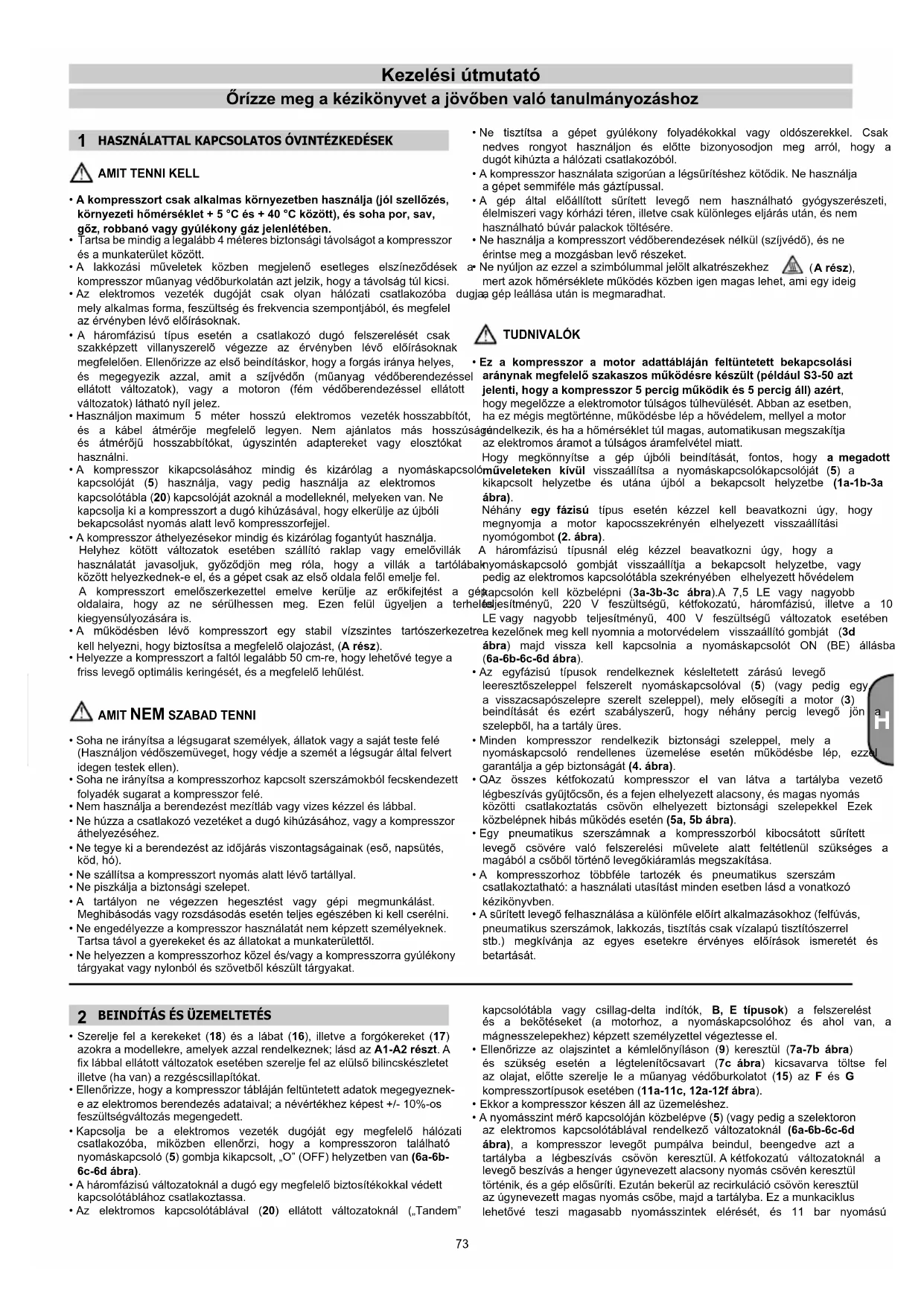 - Ez a kompresszor a motor adattábláján feltüntetett bekapcsolási aránynak megfelelő szakaszos működésre készült (például S3-50 azt jelenti, hogy a kompresszor 5 percig működik és 5 percig áll) azért,hogymegelőzzeaelektromotortúlságostúlhevülését.Abbanazesetben,haezmégismegtörténne,működésbelépahővédelem,mellyelamotorrendelkezik,éshaahőmérséklettúlmagas,automatikusanmegszakítjaazelektromosáramotatúlságosáramfelvételmiatt. Hogy megkönnyítse a gép újbóli beindítását, fontos, hogy a megadott műveleteken kívül visszaállítsa a nyomáskapcsolókapcsolóját (5) a kikapcsolt helyzetbe és utána újból a bekapcsolt helyzetbe (1a-1b-3a ábra). Néhány egy fázisú típus esetén kézzel kell beavatkozni úgy, hogymegnyomja a motor kapocsszekrényén elhelyezett visszaállításinyomógombot(2. ábra). A háromfázisú típusnál elég kézzel beavatkozni úgy, hogy anyomáskapcsoló gombját visszaállítja a bekapcsolt helyzetbe, vagypedigazelektromoskapcsolótáblaszekrényében elhelyezetthővédelem kapcsolón kell közbelépni(3a-3b-3c ábra).A 7,5 LE vagy nagyobb teljesítményű, 220 V feszültségű, kétfokozatú, háromfázisú, illetve a 10LEvagy nagyobb teljesítményű, 400 V feszültségű változatok esetébenakezelőnekmegkellnyomniaamotorvédelem visszaállítógombját (3d ábra) majd vissza kell kapcsolnia a nyomáskapcsolót ON (BE) állásba(6a-6b-6c-6d ábra).•Az egyfázisú típusok rendelkeznek késleltetett zárású levegőleeresztőszeleppel felszerelt nyomáskapcsolóval (5) (vagy pedig egy, a visszacsapószelepre szerelt szeleppel), mely elősegíti a motor (3) beindítását és ezért szabályszerű, hogy néhány percig levegő jön aszelepből,haatartályüres.•Minden kompresszor rendelkezik biztonsági szeleppel, mely anyomáskapcsoló rendellenes üzemelése esetén működésbe lép, ezzelgarantáljaagépbiztonságát(4. ábra).•QAz összes kétfokozatú kompresszor el van látva a tartályba vezetőlégbeszívásgyűjtőcsőn,ésafejenelhelyezettalacsony,ésmagasnyomásközötti csatlakoztatás csövön elhelyezett biztonsági szelepekkel Ezekközbelépnekhibásműködésesetén(5a, 5b ábra).•Egy pneumatikus szerszámnak a kompresszorból kibocsátott sűrítettlevegő csövére való felszerelési művelete alatt feltétlenül szükséges amagábólacsőbőltörténőlevegőkiáramlásmegszakítása.•A kompresszorhoz többféle tartozék és pneumatikus szerszámcsatlakoztatható:ahasználatiutasítástmindenesetbenlásdavonatkozókézikönyvben.•Asűrítettlevegőfelhasználásaakülönféleelőírtalkalmazásokhoz(felfúvás,pneumatikusszerszámok,lakkozás,tisztításcsakvízalapútisztítószerrelstb.) megkívánja az egyes esetekre érvényes előírások ismeretét ésbetartását.