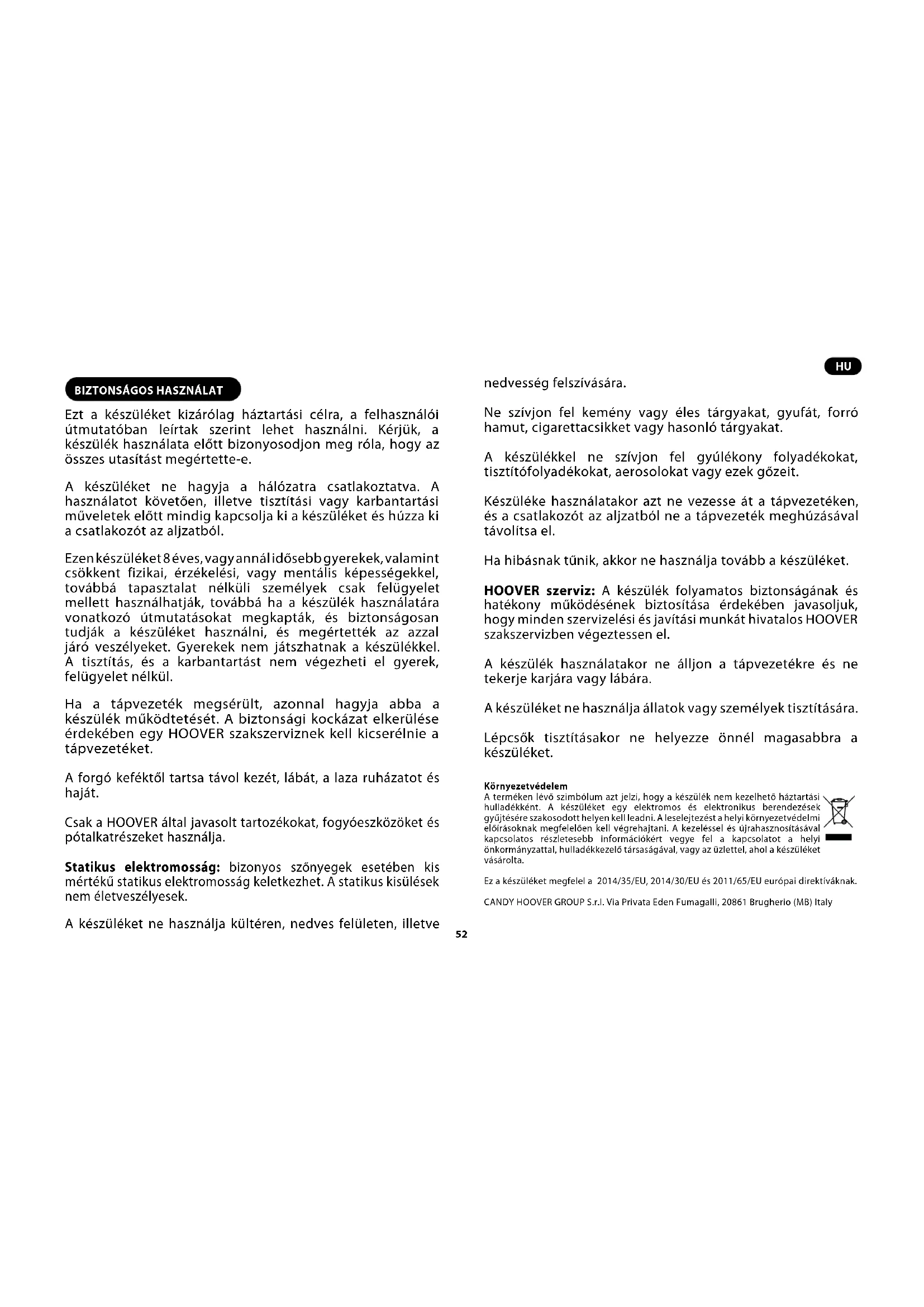 Ezt a készüléket kizárólag háztartási célra, a felhasználói útmutatóban leírtak szerint lehet használni. Kérjük, a készülék használata előtt bizonyosodjon meg róla, hogy az összes utasítást megértette-e. A készüléket ne hagyja a hálózatra csatlakoztatva. A használatot követően, illetve tisztítási vagy karbantartási műveletek elő tt mindig kapcsolja ki a készüléket és húzza ki a csatlakozót az aljzatból. Ezen készüléket 8 éves, vagy annál idősebb gyerekek, valamint csökkent fizikai, érzékelési, vagy mentális képességekkel, továbbá tapasztalat nélküli személyek csak felügyelet mellett használhatják, továbbá ha a készülék használatára vonatkozó útmutatásokat megkapták, és biztonságosan tudják a készüléket használni, és megértették az azzal járó veszélyeket. Gyerekek nem játszhatnak a készülékkel. A tisztítás, és a karbantartást nem végezheti el gyerek, felügyelet nélkül. Ha a tápvezeték megsérült, azonnal hagyja abba a készülék működtetését. A biztonsági kockázat elkerülése érdekében egy HOOVER szakszerviznek kell kicserélnie a tápvezetéket. A forgó keféktől tartsa távol kezét, lábát, a laza ruházatot és haját. Csak a HOOVER által javasolt tartozékokat, fogyóeszközöket és pótalkatrészeket használja. Statikus elektromosság: bizonyos szőnyegek esetében kis mértékű statikus elektromosság keletkezhet. A statikus kisülések nem életveszélyesek. A készüléket ne használja kültéren, nedves felületen, illetve nedvesség felszívására. Ne szívjon fel kemény vagy éles tárgyakat, gyufát, forró hamut, cigarettacsikket vagy hasonló tárgyakat. A készülékkel ne szívjon fel gyúlékony folyadékokat, tisztítófolyadékokat, aerosolokat vagy ezek gőzeit. Készüléke használatakor azt ne vezesse át a tápvezetéken, és a csatlakozót az aljzatból ne a tápvezeték meghúzásával távolítsa el. Ha hibásnak tűnik, akkor ne használja tovább a készüléket. HOOVER szerviz: A készülék folyamatos biztonságának és hatékony működésének biztosítása érdekében javasoljuk, hogy minden szervizelési és javítási munkát hivatalos HOOVER szakszervizben végeztessen el. A készülék használatakor ne álljon a tápvezetékre és ne tekerje karjára vagy lábára. A készüléket ne használja állatok vagy személyek tisztítására. Lépcsők tisztításakor ne helyezze önnél magasabbra a készüléket. Környezetvédelem A terméken lévő szimbólum azt jelzi, hogy a készülék nem kezelhető háztartási hulladékként. A készüléket egy elektromos és elektronikus berendezések gyűjtésére szakosodott helyen kell leadni. A leselejtezést a helyi környezetvédelmi előírásoknak megfelelően kell végrehajtani. A kezeléssel és újrahasznosításával kapcsolatos részletesebb információkért vegye fel a kapcsolatot a helyi önkormányzattal, hulladékkezelő társaságával, vagy az üzlettel, ahol a készüléket vásárolta. Ez a készüléket megfelel a 2014/35/EU, 2014/30/EU és 2011/65/EU európai direktíváknak. CANDY HOOVER GROUP S.r.l. Via Privata Eden Fumagalli, 20861 Brugherio (MB) Italy