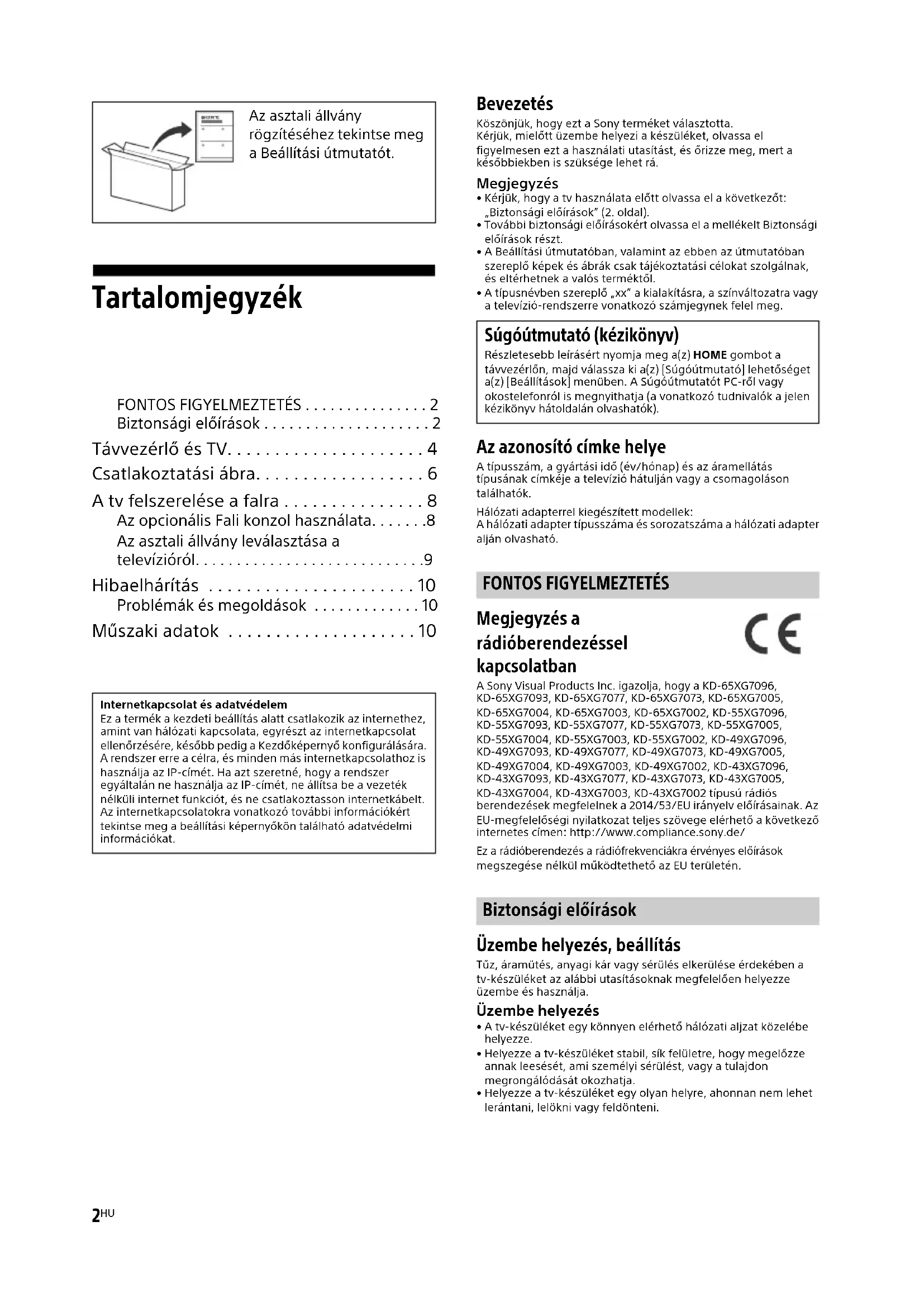 Megjegyzés a rádióberendezéssel kapcsolatban A Sony Visual Products Inc. igazolja, hogy a KD-65XG7096, KD-65XG7093, KD-65XG7077, KD-65XG7073, KD-65XG7005, KD-65XG7004, KD-65XG7003, KD-65XG7002, KD-55XG7096, KD-55XG7093, KD-55XG7077, KD-55XG7073, KD-55XG7005, KD-55XG7004, KD-55XG7003, KD-55XG7002, KD-49XG7096, KD-49XG7093, KD-49XG7077, KD-49XG7073, KD-49XG7005, KD-49XG7004, KD-49XG7003, KD-49XG7002, KD-43XG7096, KD-43XG7093, KD-43XG7077, KD-43XG7073, KD-43XG7005, KD-43XG7004, KD-43XG7003, KD-43XG7002 típusú rádiós berendezések megfelelnek a 2014/53/EU irányelv előírásainak. Az EU-megfelelőségi nyilatkozat teljes szövege elérhető a következő internetes címen: http://www.compliance.sony.de/Ez a rádióberendezés a rádiófrekvenciákra érvényes előírások megszegése nélkül működtethető az EU területén. Biztonsági előírások Üzembe helyezés, beállítás Tűz, áramütés, anyagi kár vagy sérülés elkerülése érdekében a tv-készüléket az alábbi utasításoknak megfelelően helyezze üzembe és használja. Üzembe helyezés