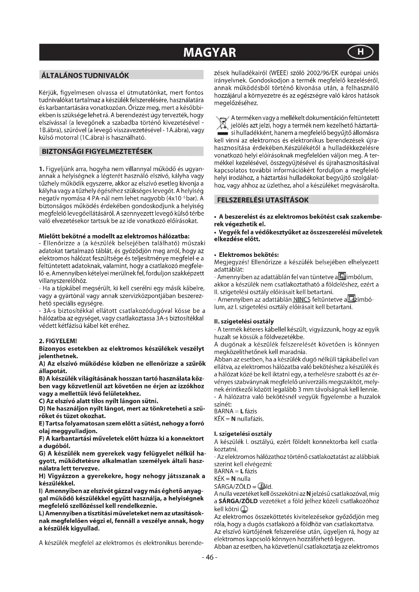 A készülék I. osztályú, ezért földelt konnektorba kell csatla- koztatni. - Az elektromos hálózathoz történő csatlakoztatást az alábbiak szerint kell elvégezni: BARNA = L fázis KÉK = N nulla SÁRGA/ZÖLD = föld. A nulla vezetéket kell összekötni az N jelzésű csatlakozóval, míg a SÁRGA/ZÖLD vezetéket a föld jelhez közeli csatlakozóhoz kell kötni . Az elektromos összeköttetés kivitelezésekor győződjön meg róla, hogy a dugós csatlakozó a földhöz van csatlakoztatva. Az elszívó kürtőjének felszerelése után, ügyeljen rá, hogy az elektromos kapcsoló könnyen hozzáférhető legyen. Abban az esetben, ha közvetlenül csatlakoztatja az elektromos- 47 - hálózatra, a készülék és a hálózat közé be kell iktatni egy a terhelésre szabott és az érvényes szabványnak megfelelő univerzális megszakítót, melynek érintkezői között legalább 3 mm legyen a távolság.