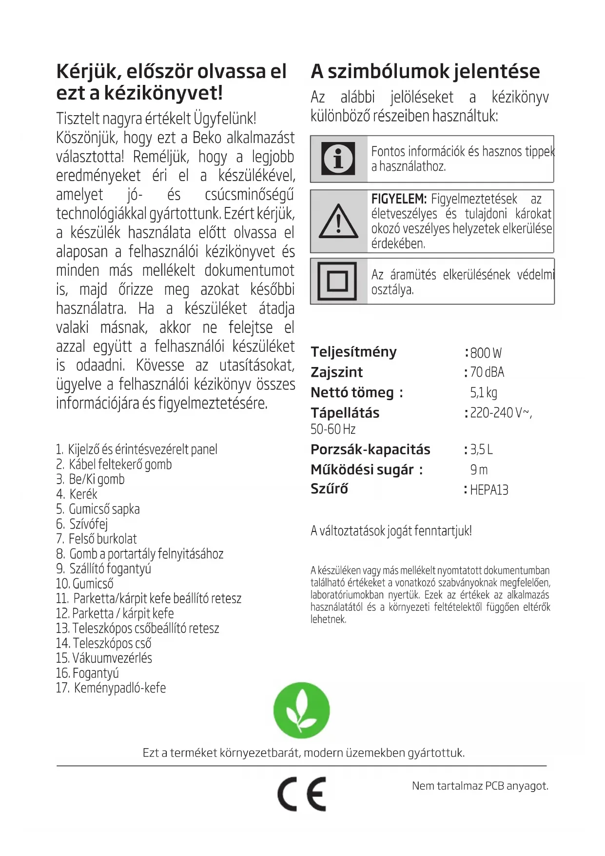 - Пазете уреда на безопасно място от деца. 2 РаботаKérjük, először olvassa el ezt a kézikönyvet! Tisztelt nagyra értékelt Ügyfelünk! Köszönjük, hogy ezt a Beko alkalmazást választotta! Reméljük, hogy a legjobb eredményeket éri el a készülékével, amelyet jó- és csúcsminőségű technológiákkal gyártottunk. Ezért kérjük, a készülék használata előtt olvassa el alaposan a felhasználói kézikönyvet és minden más mellékelt dokumentumot is, majd őrizze meg azokat későbbi használatra. Ha a készüléket átadja valaki másnak, akkor ne felejtse el azzal együtt a felhasználói készüléket is odaadni. Kövesse az utasításokat, ügyelve a felhasználói kézikönyv összes információjára és figyelmeztetésére. Ezt a terméket környezetbarát, modern üzemekben gyártottuk.Nem tartalmaz PCB anyagot. A szimbólumok jelentése Az alábbi jelöléseket a kézikönyv különböző részeiben használtuk:
