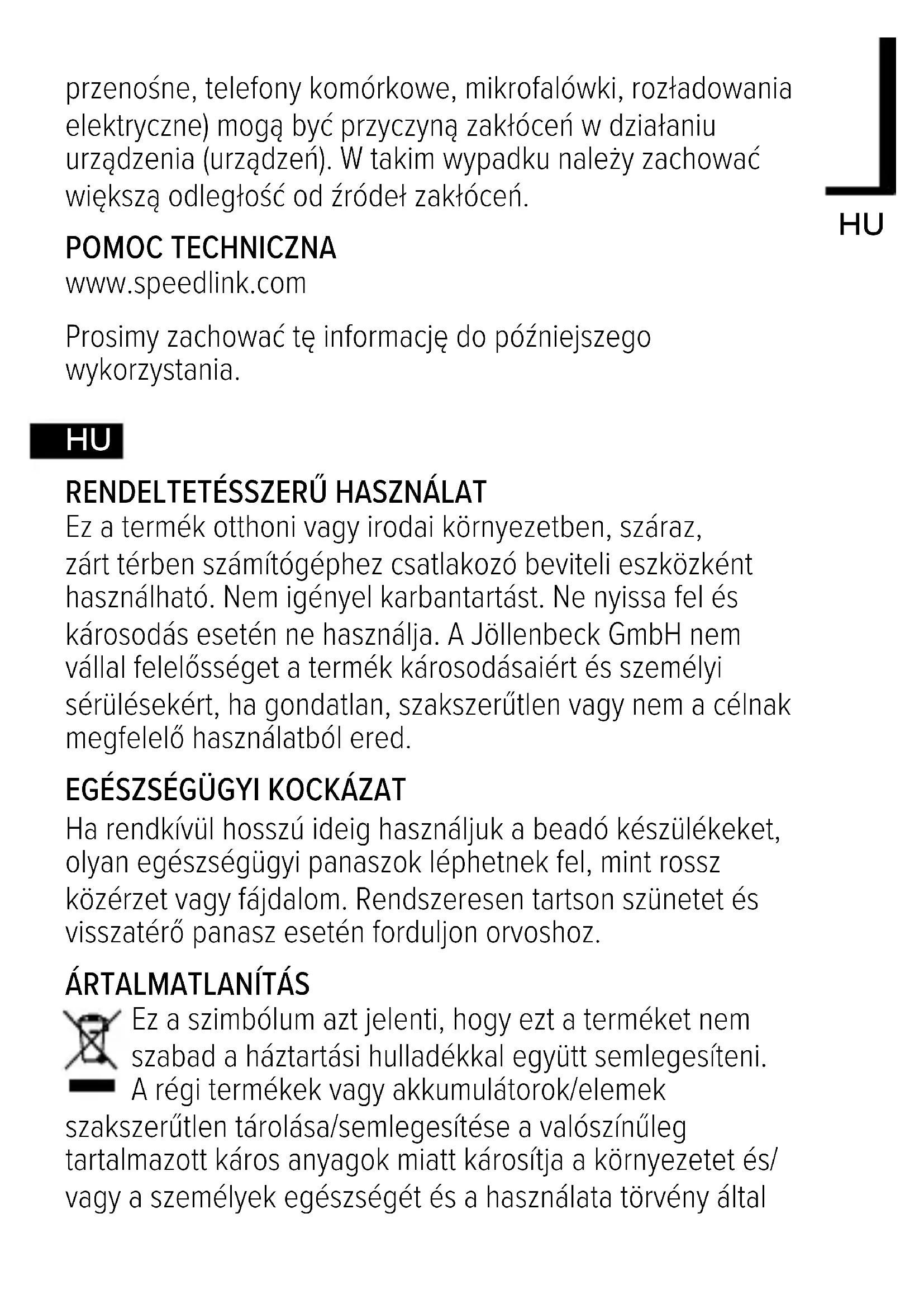 Ez a termek otthoni vagy irodai környezetben, száraz, zárt terben számítogéphez csatlakozó beviteli eszkózként használható. Nem igényel karbantartást. Ne nyissa fel és károsodás esétén ne használja. A Jöllenbeck GmbH nem vällal felelosséget a termek károsodásaiiert és személyi sérulésekert, ha gondatlan, szakszerütlen vagy nem a célnak megfelelohasznalataból ered.