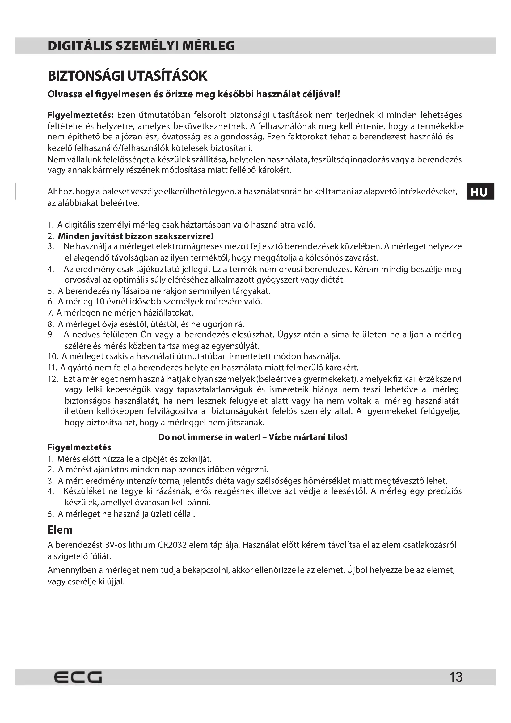 - Ezt a merleget nem hasznalhatjak olyan szemelyek (beleertve a gyermekeket), amelyek fizikai, erzekszervi vagy leki képességuk vagy tapasztalatlanságuk és ismereteik hianya nem teszi lehetőve a merleg biztonságos hasznalatát, ha nem lesznek felügyelet alatt vagy ha nem voltak a merleg hasznalatát iltoen kelloképpen felvilagosítva a biztonságukér feelós szemely által. A gyermekeket felügyelje, hogybiztositsa azt, hogy a merleggel nem jatszanak.