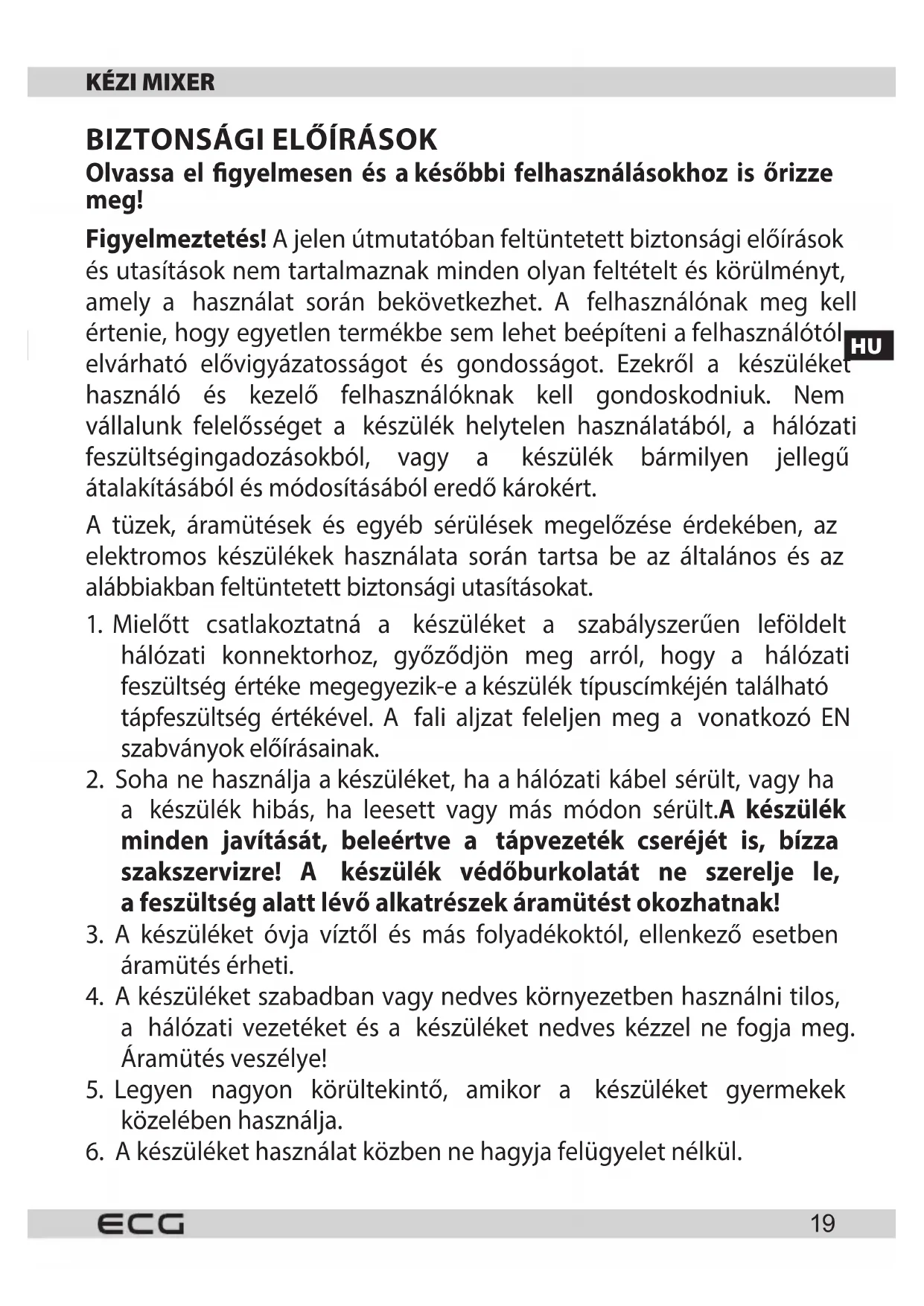 Miután akeverőszárakat kivette, atálat műanyag vagy gumi keverőlapáttal kaparja ki. EHHEZ SOSE HASZNÁLJON KÉST, FÉM KANALAT VAGY VILLÁT, mert ezekkel megsértheti atálat vagy akeverőszárakat. Ha keverés közben, az adalékok hozzáadása után időnként lekaparja atál falára ragadt keveréket, ezzel jobb eredményt érhet el. CSAK AFOGYASZTÓVAL EGYÜTT SZÁLLÍTOTT TARTOZÉKOKAT HASZNÁLJON! MŰSZAKI JELLEMZŐK: Névleges feszültség: 220–240 V Névleges frekvencia: 50/60 Hz Névleges teljesítményfelvétel: 400 W Zajszint: ≤ 87 dB GARANCIA: A következő használati mód a garancia megszűnését jelenti: A készüléket szakszerűtlenül és nem a használati útmutató szerint, illetve a rendeltetésétől eltérő célokra használták, biztonsági utasításokat nem tartották be, nagy erőt fejtettek ki, a készüléket nem a márkaszerviz javította. A normál használatból eredő kopásoknak kitett alkatrészekre a garancia nem vonatkozik. HULLADÉKFELHASZNÁLÁS ÉS MEGSEMMISÍTÉS A csomagolópapírt és hullámpapírt adja le hulladékgyűjtő telepen. Csomagolófólia, PE zacskók, műanyag alkatrészek – műanyaggyűjtő szelektív hulladéktároló edénybe. ÉLETTARTAM LEJÁRTÁT KÖVETŐ MEGSEMMISÍTÉS Használt elektromos és elektronikus készülékek megsemmisítése (érvényes az EU tagállamokban és számos szelektív hulladékgyűjtést végző európai országban) Ez a terméken vagy csomagolásán található jelzés azt mutatja, hogy a terméket tilos standard háztartási hulladékként megsemmisíteni. A terméket elektromos és elektronikus berendezések újrahasznosítására szakosodott hulladékgyűjtő telepen adja le. A termék helyes megsemmisítésével megelőzi, hogy káros hatást fejtsen ki az emberi egészségre és környezetünkre. Az anyagok újrahasznosítása kíméli a természetes forrásainkat. A termék újrahasznosításával kapcsolatosan bővebb információkat a helyi önkormányzattól, aháztartási hulladékot feldolgozó szervezettől, vagy a termék forgalmazójától kérhet. Ez a termék megfelel a kisfeszültségű berendezések biztonságára és az elektromágneses kompatibilitásra vonatkozó EU irányelveknek. A készülék használati útmutatója a www.ecg-electro.eu oldalon található. A szöveg és a műszaki paraméterek megváltoztatásának a joga fenntartva.
