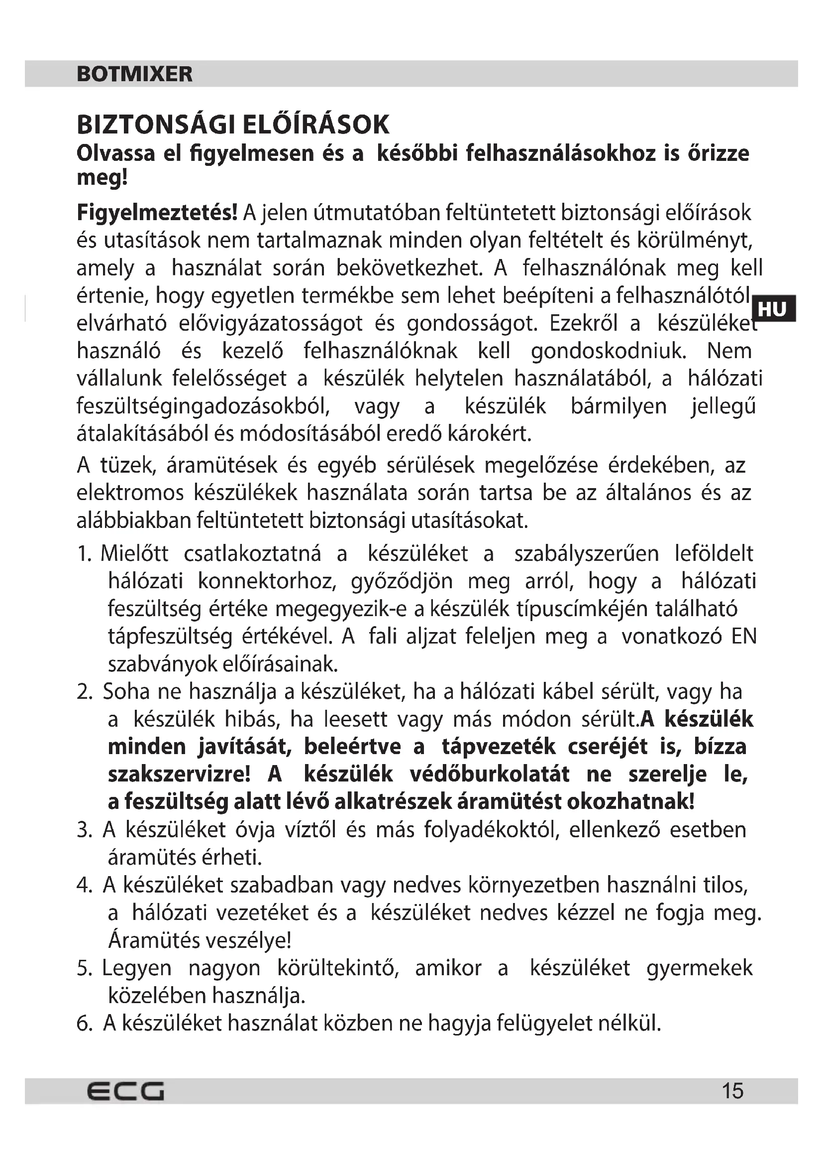 Névleges feszültség: 220–240 V ~ 50/60 Hz Névleges teljesítmény-felvétel: 400 W HULLADÉKFELHASZNÁLÁS ÉS MEGSEMMISÍTÉS A csomagolópapírt és hullámpapírt adja le hulladékgyűjtő telepen. Csomagolófólia, PE zacskók, műanyag alkatrészek – műanyaggyűjtő szelektív hulladéktároló edénybe. ÉLETTARTAM LEJÁRTÁT KÖVETŐ MEGSEMMISÍTÉS Használt elektromos és elektronikus készülékek megsemmisítése (érvényes az EU tagállamokban és számos szelektív hulladékgyűjtést végző európai országban)Ez a terméken vagy csomagolásán található jelzés azt mutatja, hogy a terméket tilos standard háztartási hulladékként megsemmisíteni. A terméket elektromos és elektronikus berendezések újrahasznosítására szakosodott hulladékgyűjtő telepen adja le. A termék helyes megsemmisítésével megelőzi, hogy káros hatást fejtsen ki az emberi egészségre és környezetünkre. Az anyagok újrahasznosítása kíméli a természetes forrásainkat. A termék újrahasznosításával kapcsolatosan bővebb információkat a helyi önkormányzattól, aháztartási hulladékot feldolgozó szervezettől, vagy a termék forgalmazójától kérhet. Ez a termék megfelel a kisfeszültségű berendezések biztonságára és az elektromágneses kompatibilitásra vonatkozó EU irányelveknek. A készülék használati útmutatója a www.ecg-electro.eu oldalon található. A szöveg és a műszaki paraméterek megváltoztatásának a joga fenntartva. 08/05STABMIXER