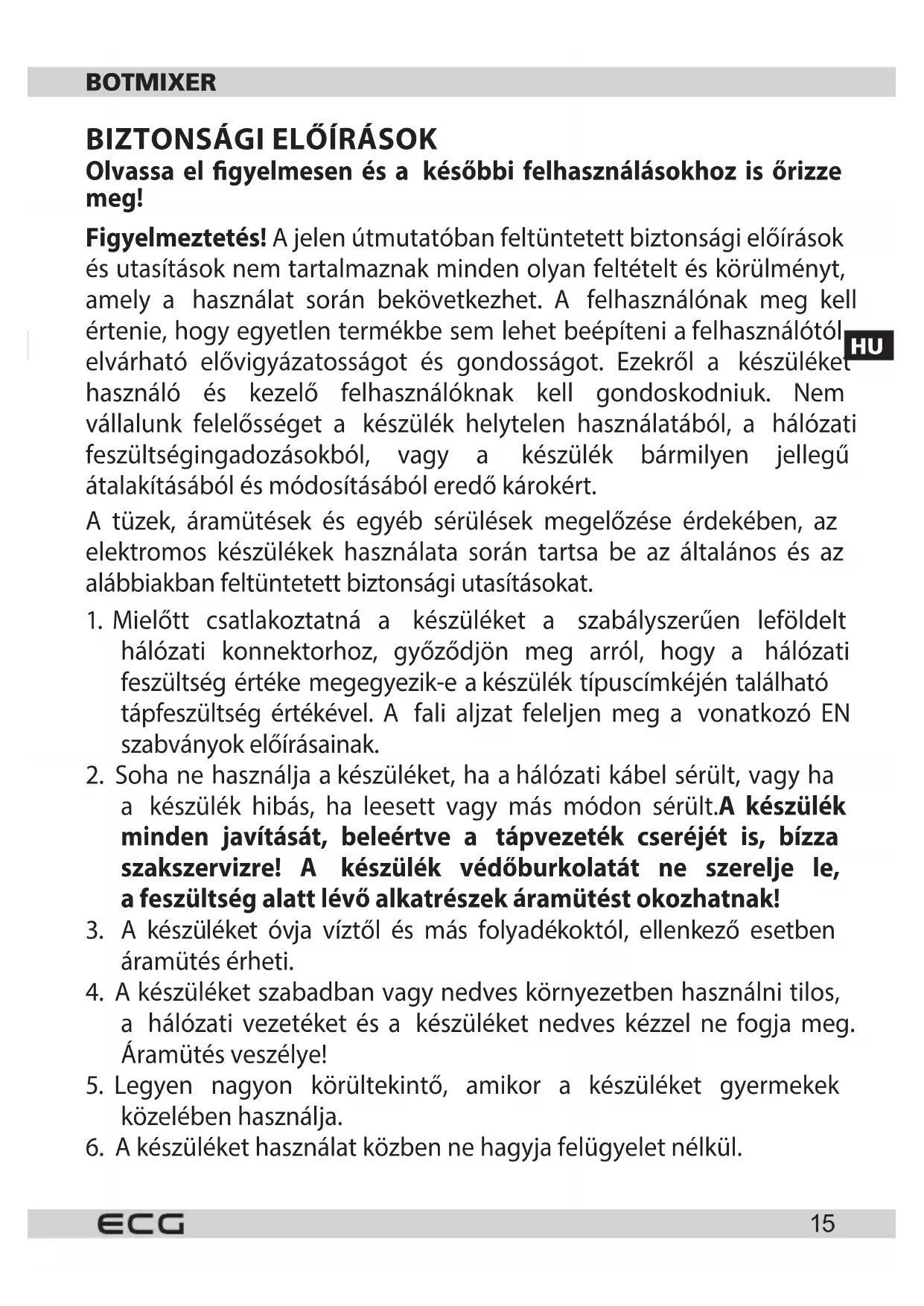 Névleges feszültség: 220–240 V ~ 50/60 Hz Névleges teljesítmény-felvétel: 400 W HULLADÉKFELHASZNÁLÁS ÉS MEGSEMMISÍTÉS A csomagolópapírt és hullámpapírt adja le hulladékgyűjtő telepen. Csomagolófólia, PE zacskók, műanyag alkatrészek – műanyaggyűjtő szelektív hulladéktároló edénybe. ÉLETTARTAM LEJÁRTÁT KÖVETŐ MEGSEMMISÍTÉS Használt elektromos és elektronikus készülékek megsemmisítése (érvényes az EU tagállamokban és számos szelektív hulladékgyűjtést végző európai országban)Ez a terméken vagy csomagolásán található jelzés azt mutatja, hogy a terméket tilos standard háztartási hulladékként megsemmisíteni. A terméket elektromos és elektronikus berendezések újrahasznosítására szakosodott hulladékgyűjtő telepen adja le. A termék helyes megsemmisítésével megelőzi, hogy káros hatást fejtsen ki az emberi egészségre és környezetünkre. Az anyagok újrahasznosítása kíméli a természetes forrásainkat. A termék újrahasznosításával kapcsolatosan bővebb információkat a helyi önkormányzattól, aháztartási hulladékot feldolgozó szervezettől, vagy a termék forgalmazójától kérhet. Ez a termék megfelel a kisfeszültségű berendezések biztonságára és az elektromágneses kompatibilitásra vonatkozó EU irányelveknek. A készülék használati útmutatója a www.ecg-electro.eu oldalon található. A szöveg és a műszaki paraméterek megváltoztatásának a joga fenntartva. 08/05STABMIXER