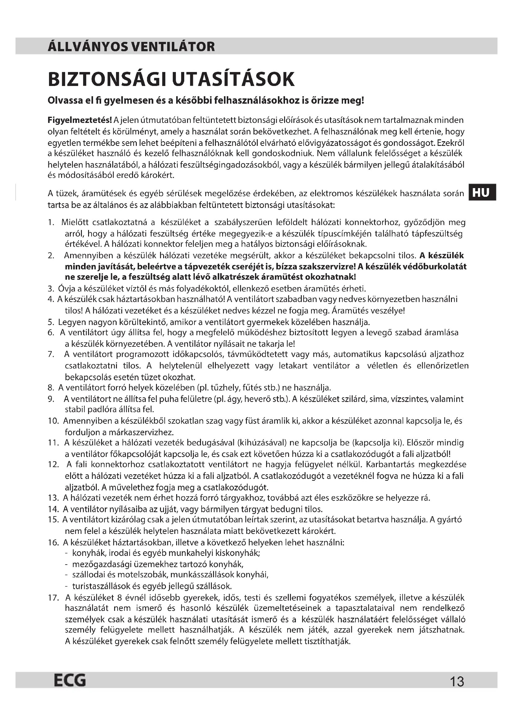 15. A ventilátort kizárólag csak ajelen útmutatóban leírtak szerint, az utasításokat betartva használja. Agyártó